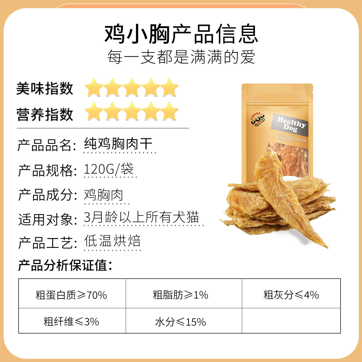领格鸡胸肉肉干精选优质鸡胸肉,采用低温慢烘工艺,锁住营养与鲜味,口感酥脆耐嚼,是狗狗训练、奖励的绝佳零食。产品无添加防腐剂、人工色素,安全健康,适合泰迪、金毛、拉布拉多等各类犬种,亦适合猫咪食用。其坚韧质地有助于清洁牙齿、缓解牙垢,起到天然磨牙效果。小条状设计便于握持,方便互动训练,增进人宠感情。无论是日常奖励、行为纠正还是旅行携带,领格鸡胸肉肉干都是宠物健康饮食的理想选择,让爱宠吃得开心,主人更放心。