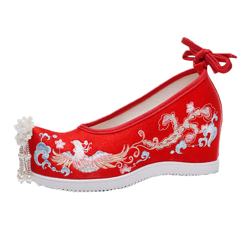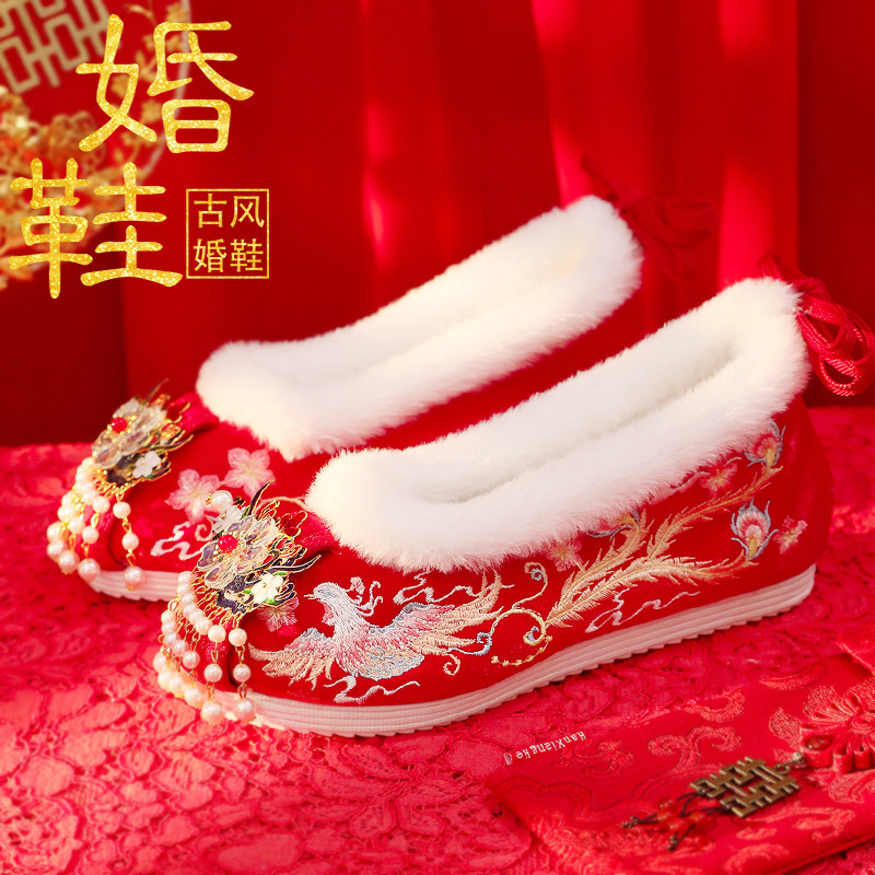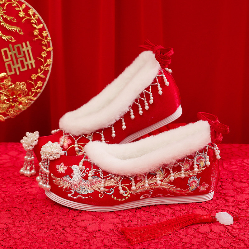 淘宝春秋新款古风中式禾服结婚鞋高低跟流苏红色翘头古装绣花汉服婚鞋