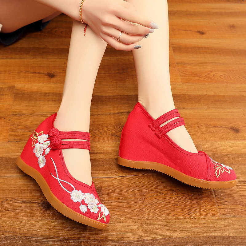 淘老北京坡跟布鞋内增高舞鞋秀禾服红色婚鞋民族风绣花鞋高跟单鞋夏