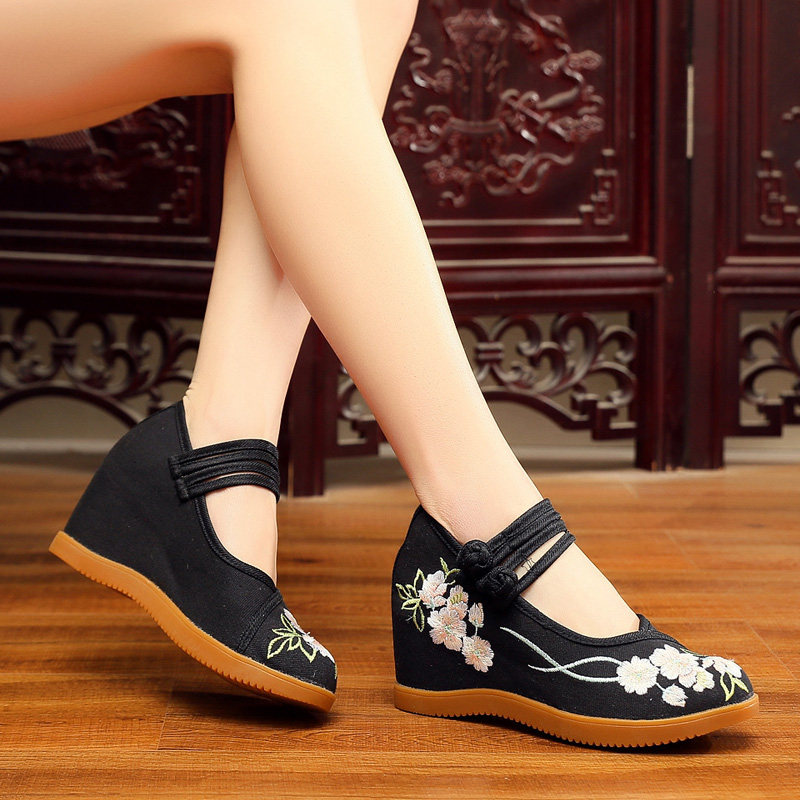 淘宝绣花鞋女2025新款民族风高跟内增高单鞋 7厘米坡跟盘扣老北京布鞋