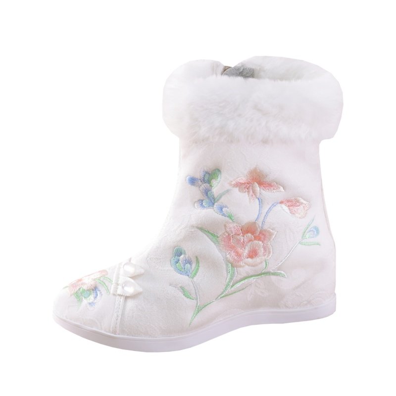 这款古风汉服棉靴融合传统中式美学与现代舒适设计,专为搭配旗袍、汉服等民族服饰打造。采用优质加绒内里,保暖透气,适合秋冬季节穿着。鞋面精致刺绣,图案多为梅花、云纹、花鸟等传统元素,尽显复古国风韵味。低跟内增高设计,悄然提升身高比例,兼顾优雅与实用。短靴版型贴合脚型,柔软棉质鞋身轻盈舒适,行走自如。无论是日常出行、节庆典礼还是摄影写真,都能展现东方女性的温婉气质与文化底蕴,是追求国风穿搭的理想之选。
