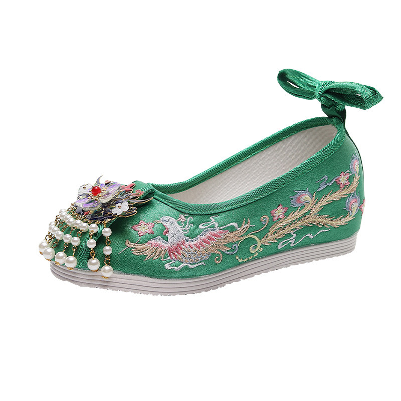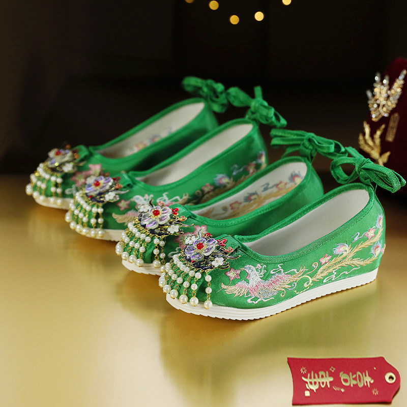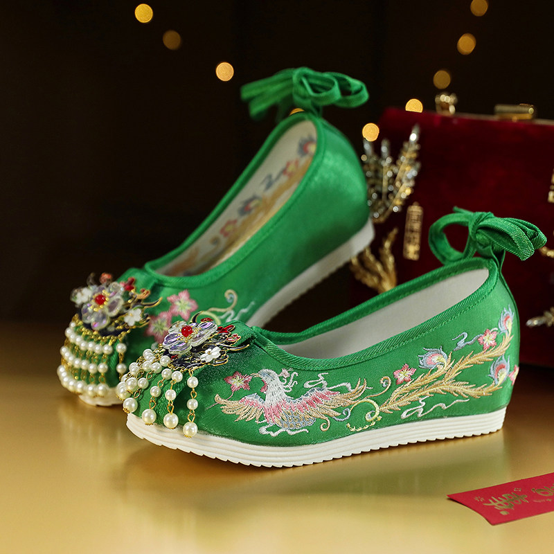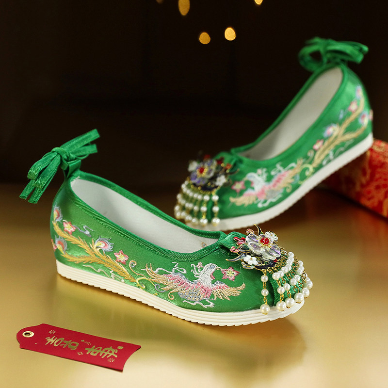 新款中式婚鞋融合传统与现代美学,专为新娘打造。采用优质绸缎面料,以精美龙凤刺绣点缀,寓意吉祥如意、百年好合。鞋型适配旗袍与秀禾服,低跟设计兼顾优雅与舒适,适合长时间穿着。特别推出的绿色款,象征生机与幸福,打破传统红色束缚,展现个性风采。高跟上轿鞋款则更显高挑气质,适合仪式关键环节。内里柔软透气,贴合脚型,行走稳健。无论是传统婚礼还是新中式风格,这款婚鞋都能完美搭配,让新娘在人生重要时刻,既承袭文化之美,又绽放独特魅力。