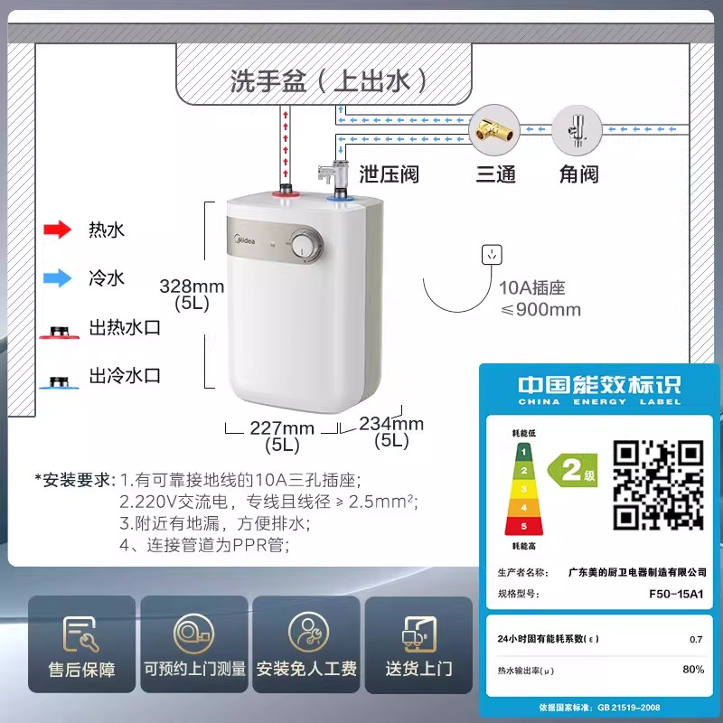 天猫美的小厨宝家用厨房热水器热水宝5L储水式卫生间小型电热水器15A1