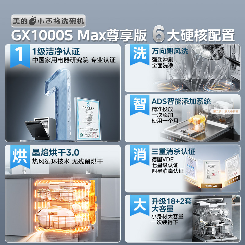 天猫美的小西梅洗碗机家用全自动烘干嵌入式GX1000SMax尊享版18套官方