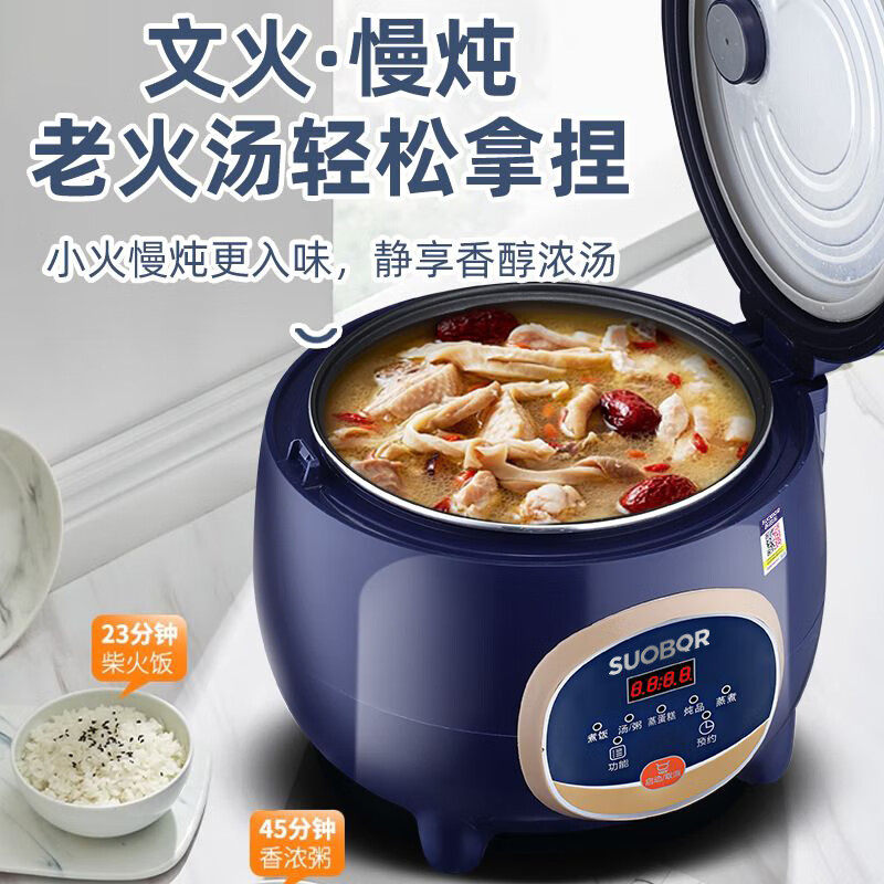 正品苏泊尔(SUOBQR)电饭煲专为1-4人家庭设计,小巧精致,适合单身、情侣或小型家庭使用。采用智能控温技术,精准调节火候,确保米饭松软香甜、口感均匀。内胆为优质不粘涂层,易清洗且耐用,有效防止米饭粘锅。支持多种烹饪模式,包括煮饭、煲汤、蒸煮等,一锅多用,满足日常饮食需求。配备24小时预约功能,轻松安排用餐时间。安全防溢设计,使用更安心。外观简约时尚,节省厨房空间。苏泊尔品牌品质保障,安全可靠,是追求便捷健康生活的理想选择。