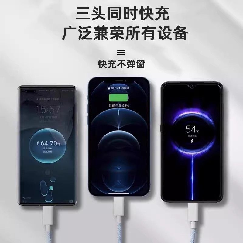 天猫数据线三合一充电线一拖三快充三头适用多头车载苹果Typec充120W手机车超级车用汽车USB伸缩多功能多用电器