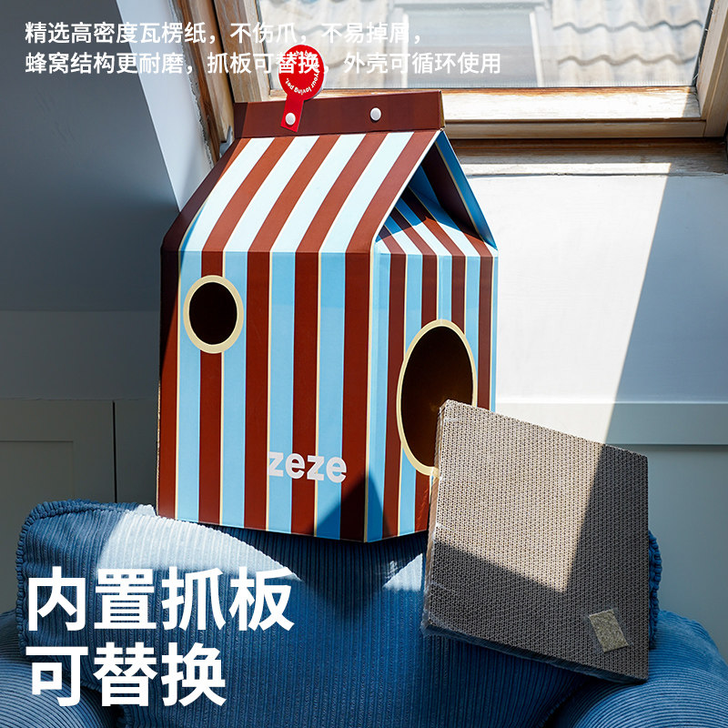 天猫ZEZE猫窝瓦楞纸猫抓板蓝棕条纹设计隐蔽空间猫咪房子躲避玩具1个