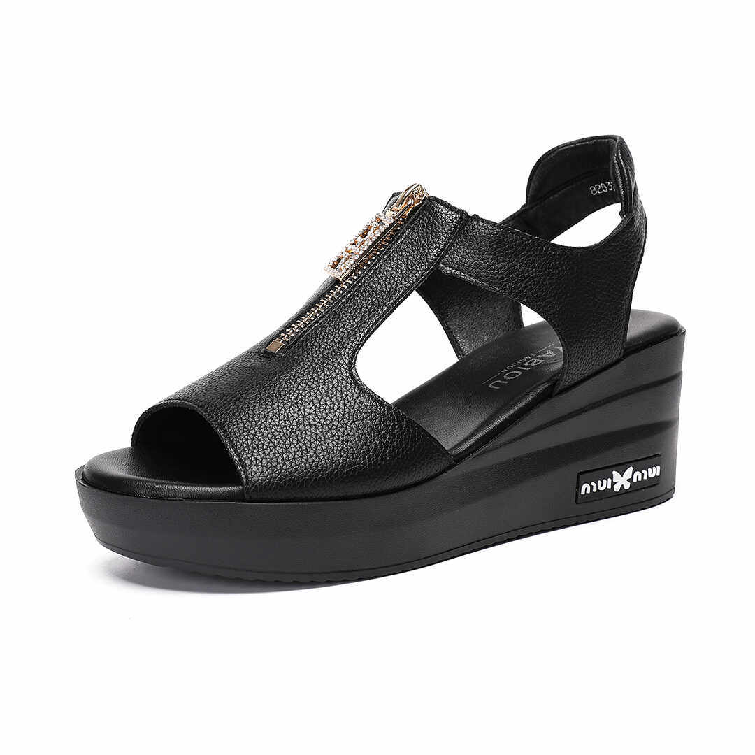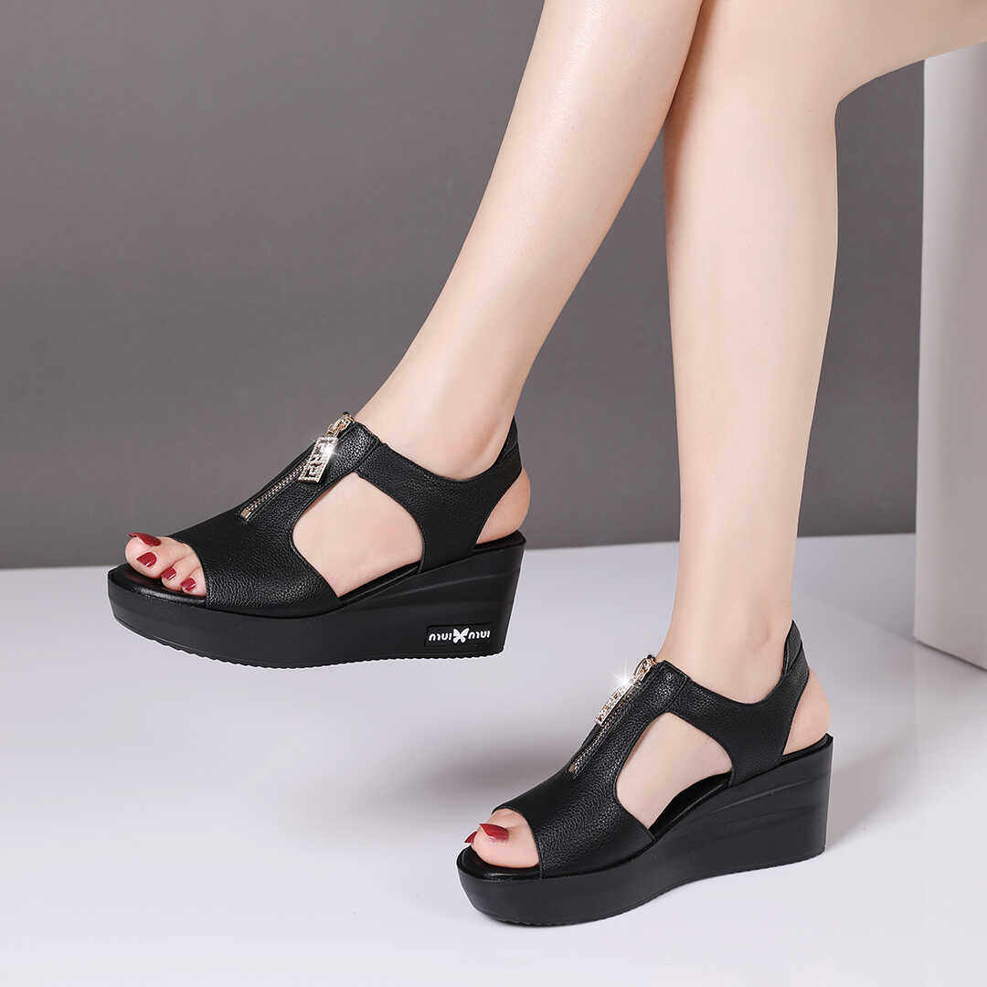淘宝真皮妈妈鞋女凉鞋舒适软底2025新款夏季中老年鱼嘴厚底坡跟鞋皮鞋
