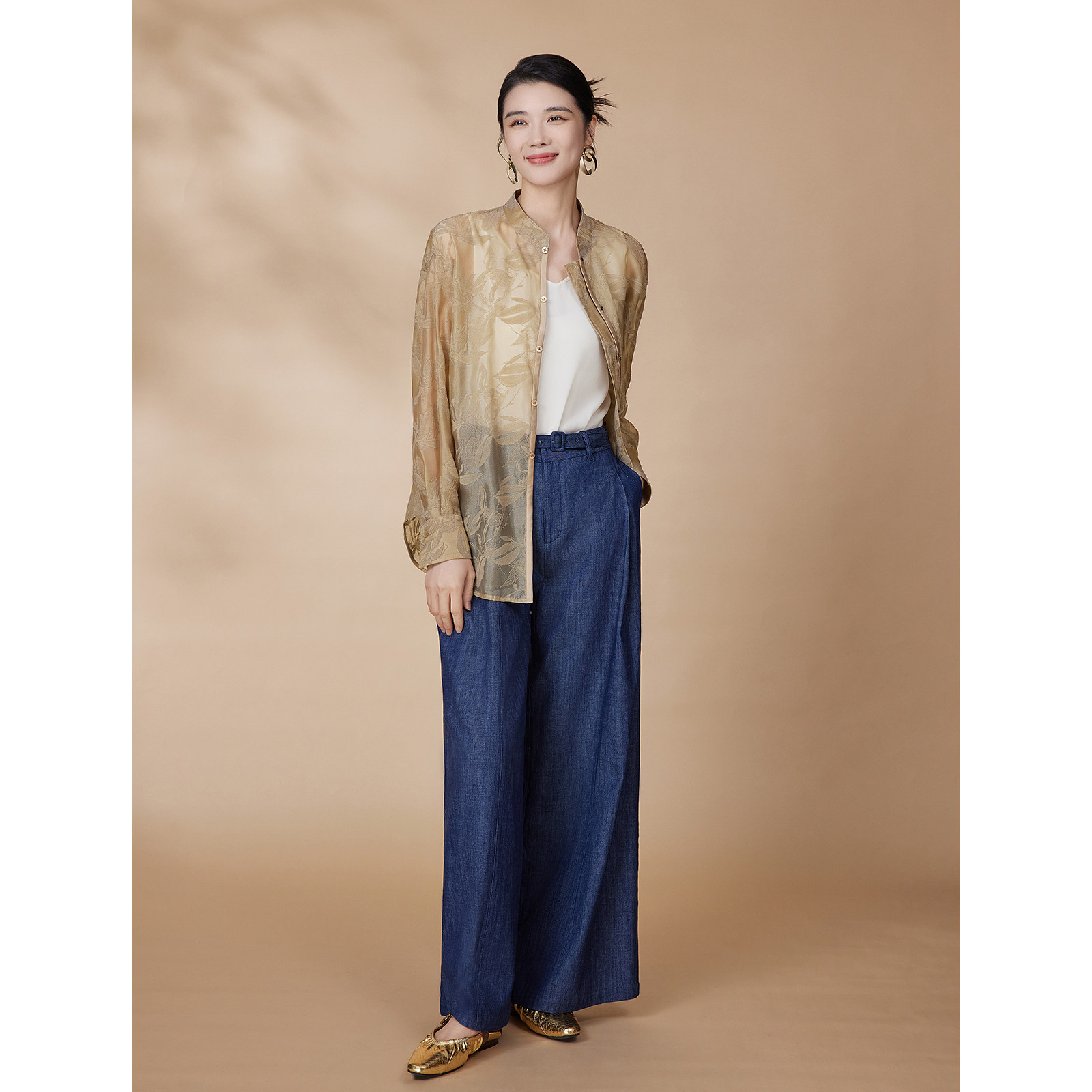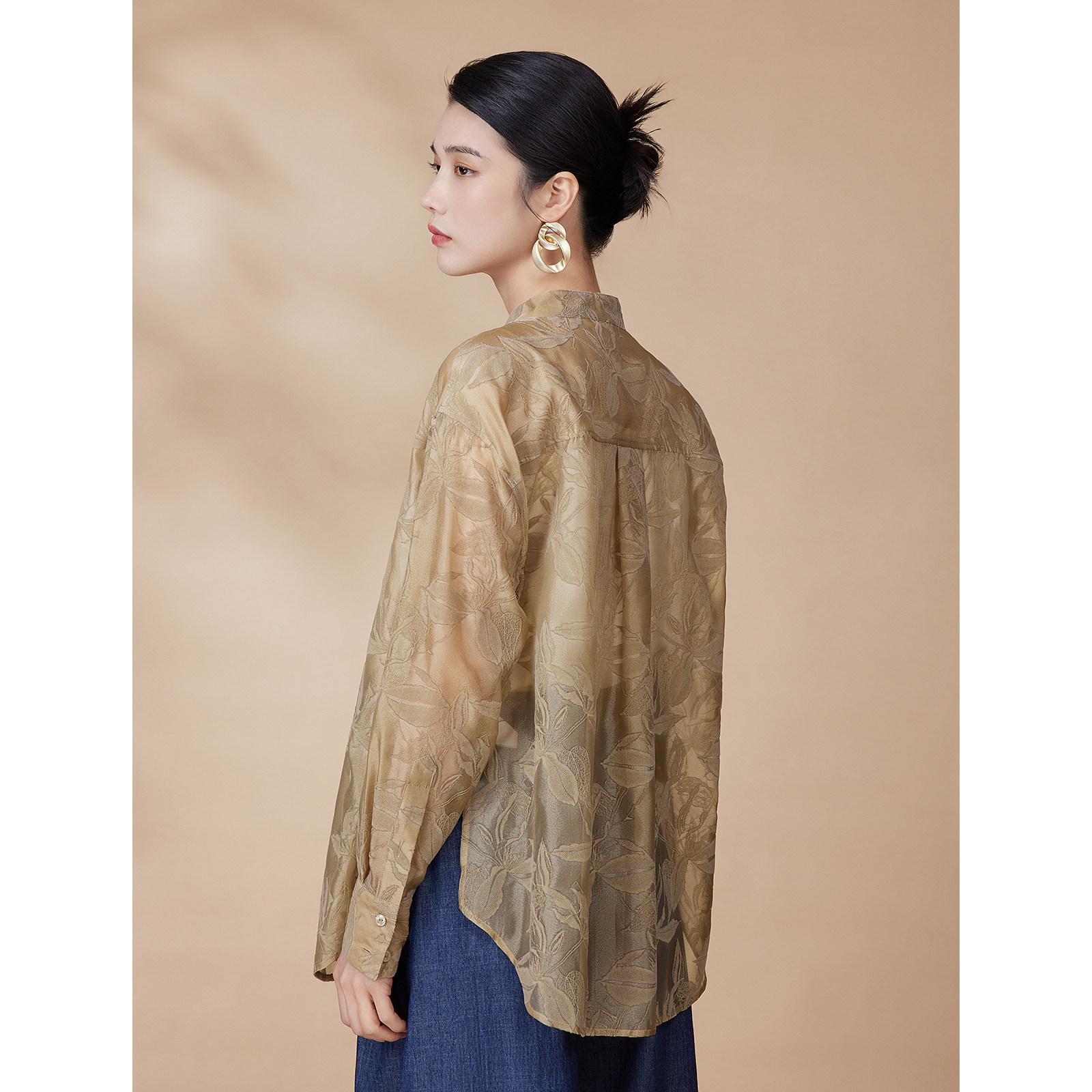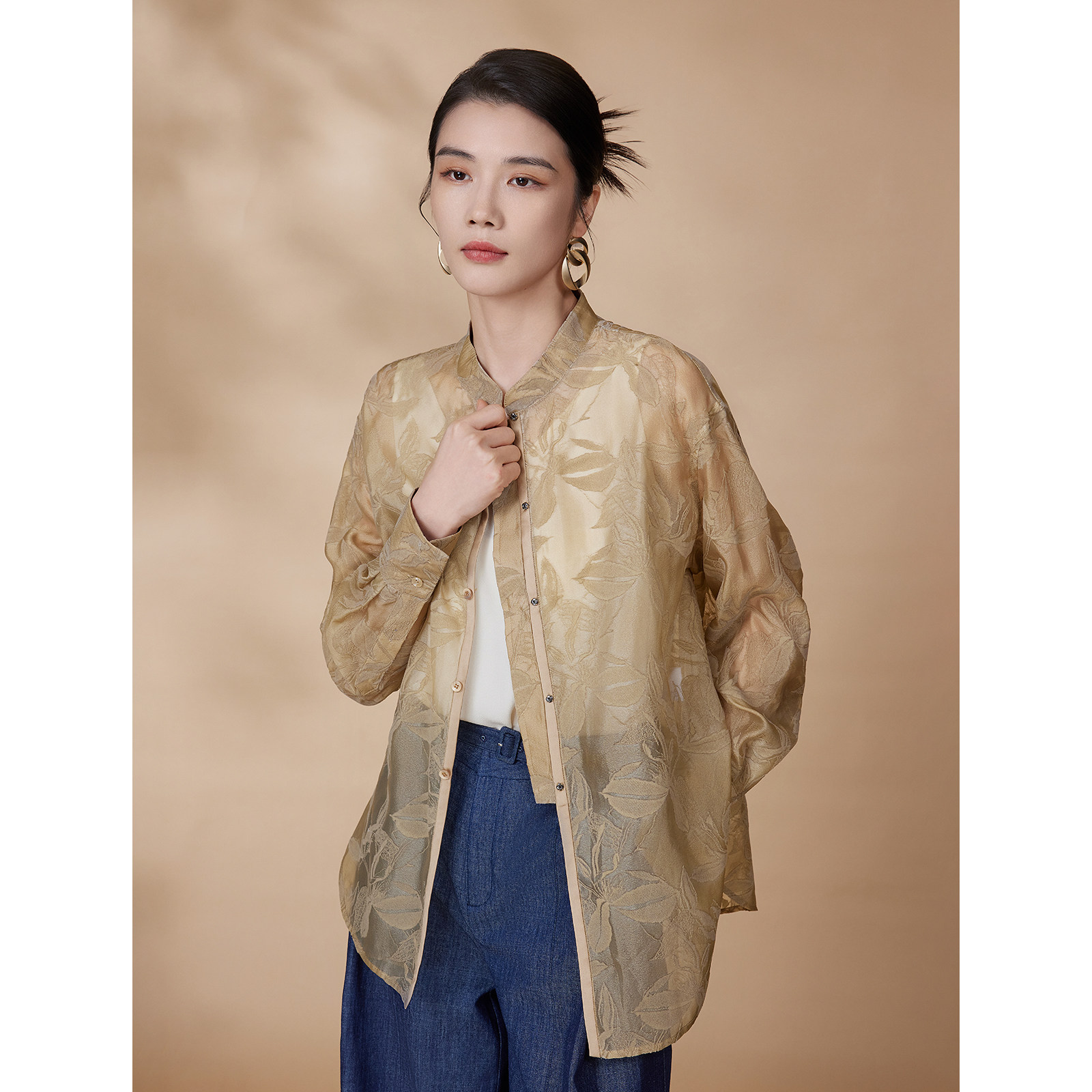 【精致烧花衬衫】BBLLUUEE粉蓝衣橱2025秋装新款轻奢新中式衬衣,以东方美学为灵感,融合现代剪裁与匠心工艺。采用高品质真丝混纺面料,触感柔滑,透气亲肤。衣身点缀细腻烧花工艺,呈现若隐若现的立体花卉纹样,雅致而不张扬。立领设计搭配斜襟盘扣,彰显新中式韵味,同时修饰颈部线条。宽松廓形兼顾舒适与时尚,适合多种身形。粉蓝低饱和色调温柔知性,轻松驾驭通勤、约会等场合。细节处精工细作,每一处缝线都体现轻奢品质。BBLLUUEE以东方雅致与现代简约,诠释当代女性的从容与优雅。