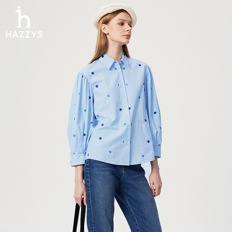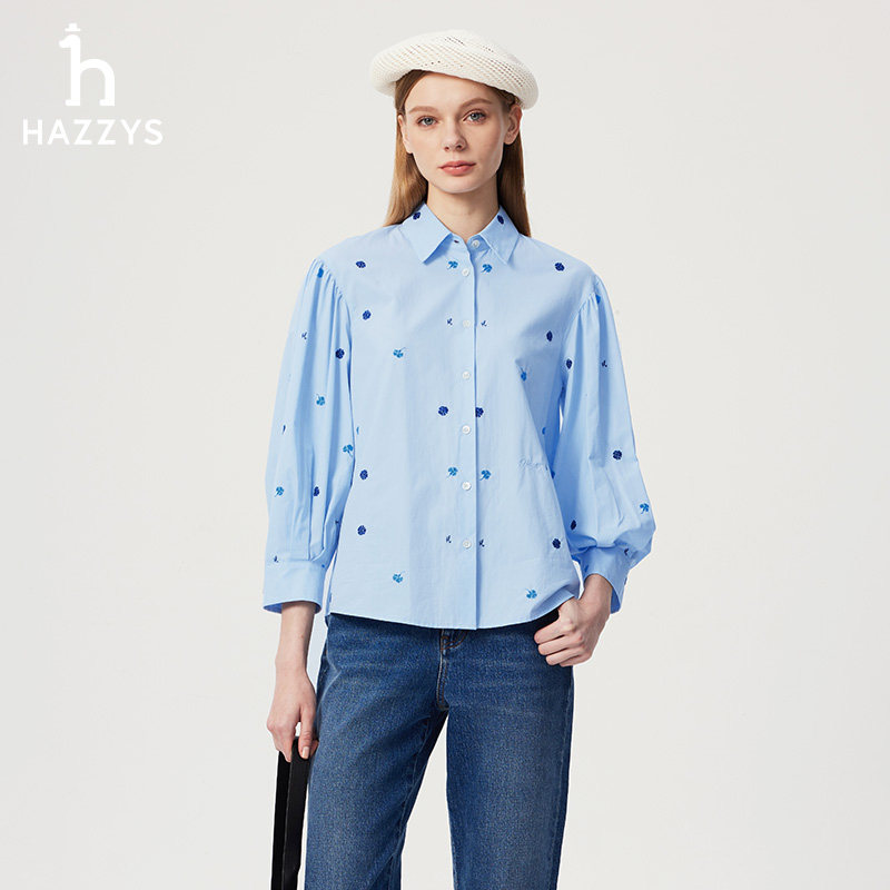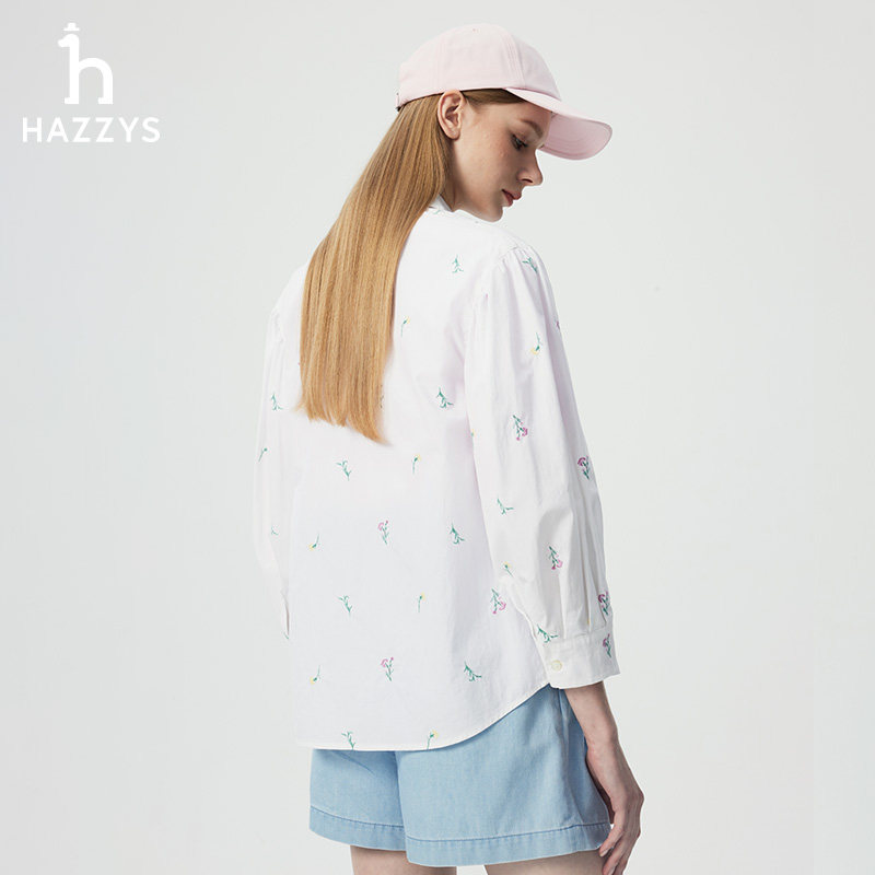 天猫Hazzys哈吉斯白色宽松绣花长袖衬衫女士春夏衬衣休闲度假上衣外套