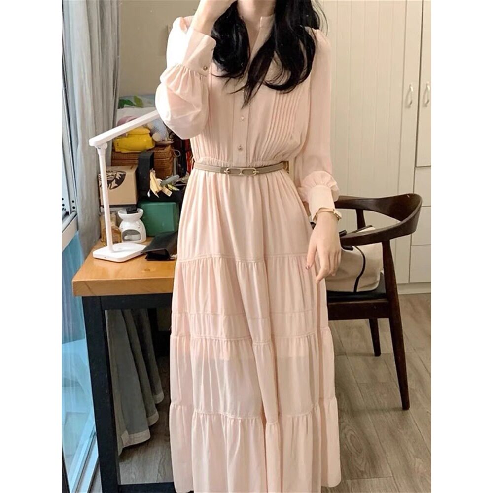 淘宝时尚春秋款气质小香风长裙法式小众设计惊艳粉色衬衫连衣裙子女装