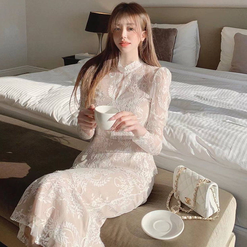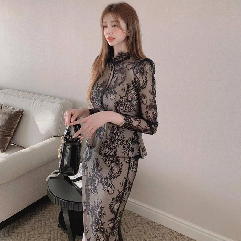 淘宝韩国chic春季法式气质立领荷叶边蕾丝衬衫+高腰包臀半身裙两件套