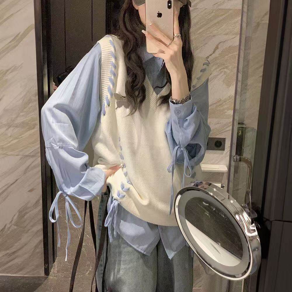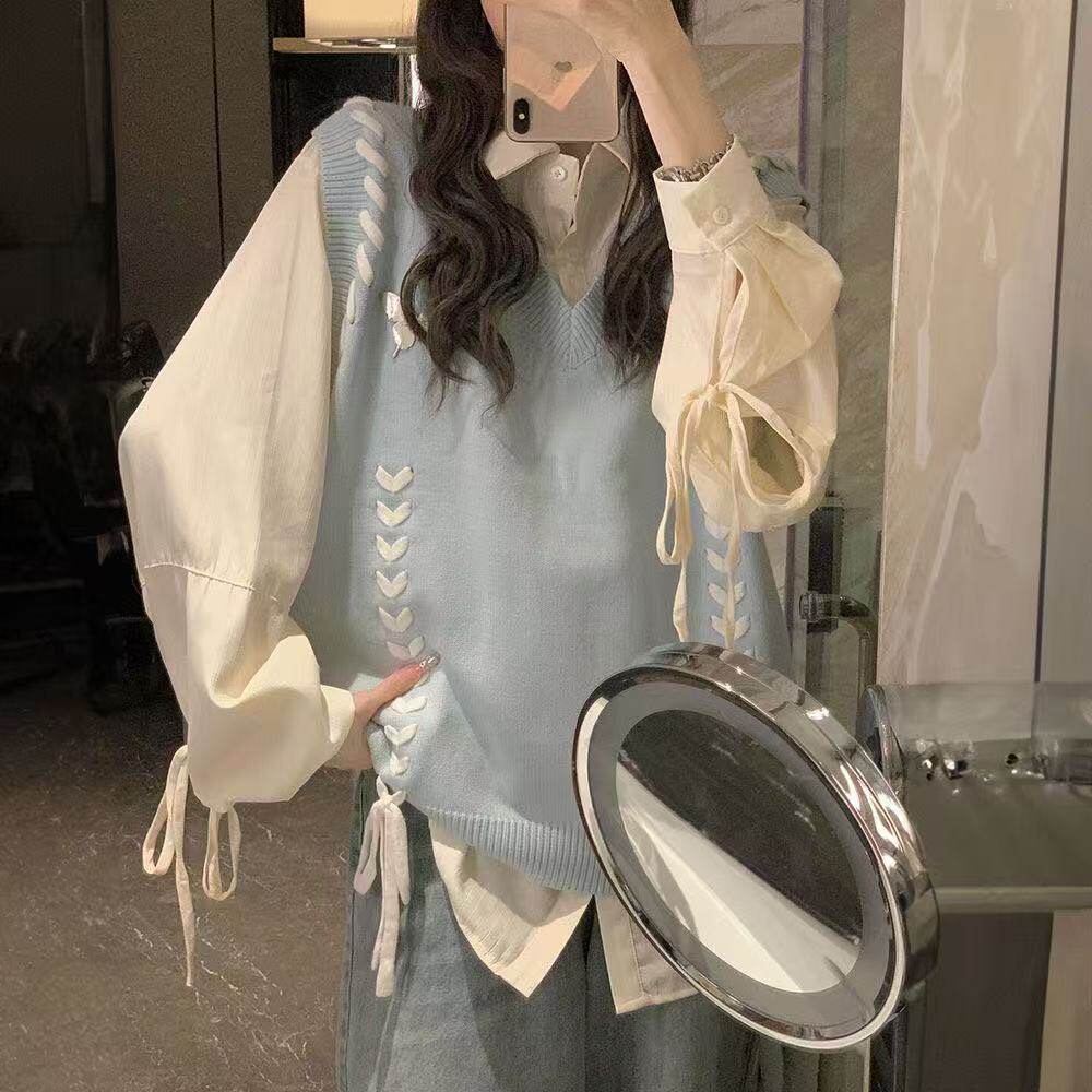 淘宝早秋甜美学院风手工明线穿绳针织衫马甲背心女+绑带衬衫两件套装