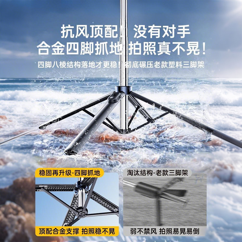 【防抖四脚】2025新款自拍杆落地三脚架,集稳定、便携与多功能于一体,专为手机摄影与直播用户打造。采用四脚支撑设计,大幅提升稳定性,有效防抖,轻松应对户外风大或不平地面。支持360度旋转调节,横竖拍自由切换,满足拍照、视频、直播等多种需求。伸缩杆身,高度可调,适配各类手机型号,通用性强。折叠后仅30cm,轻巧便携,旅行、露营、居家皆宜。无论是自拍、Vlog录制还是多人合影,都能轻松搞定,是摄影爱好者和直播达人的必备神器。