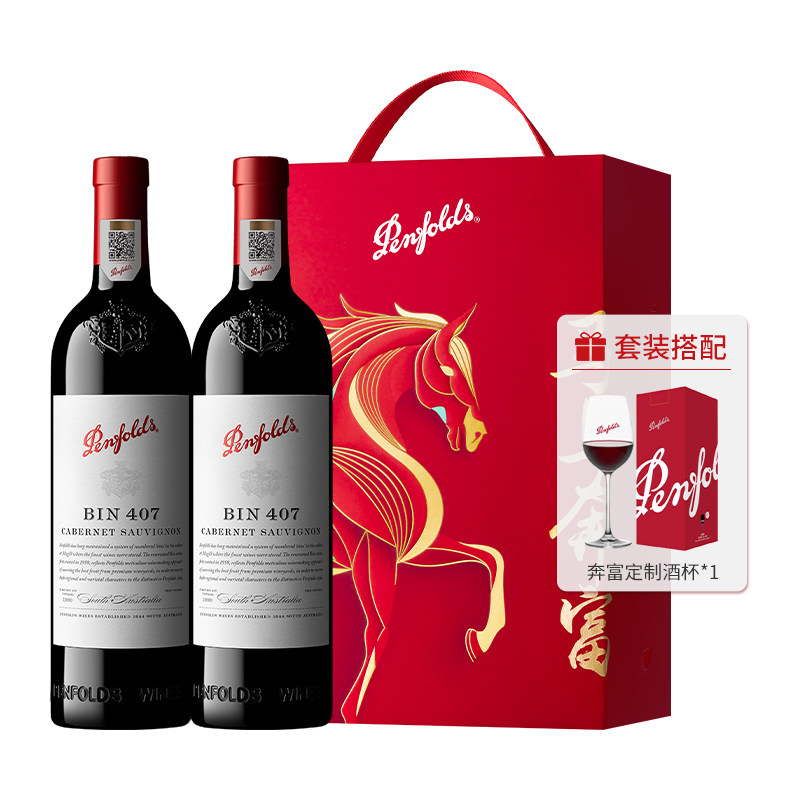 【国行】奔富BIN407红酒马年礼盒装,精选澳洲进口赤霞珠干红葡萄酒,源自世界知名酒庄Penfolds的经典之作。BIN407以其深邃的宝石红色泽、浓郁的黑色水果香气与优雅的橡木桶陈酿风味著称,口感醇厚,单宁细腻,余味悠长。此款马年特别礼盒装,融合中国传统文化元素,包装精美大气,寓意吉祥如意,是新春佳节馈赠亲友、商务往来的理想之选。作为奔富家族中广受欢迎的代表作之一,BIN407不仅品质卓越,更承载节日祝福,为国人的年味增添一抹醇香与尊贵。