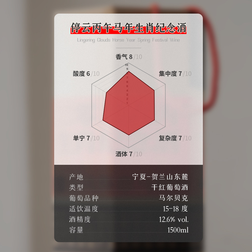 马年大吉|1.5L大瓶礼盒装|停云马尔贝克马年生肖纪念干红葡萄酒,甄选阿根廷优质马尔贝克葡萄精心酿制,酒体饱满,果香浓郁,散发黑莓、李子与淡淡香料的优雅气息,单宁柔顺,回味悠长。特别以中国传统生肖文化为灵感,瓶身融合骏马图腾与祥云纹饰,寓意奔腾进取、福运绵长。1.5L大容量礼盒装设计大气典雅,适合节庆馈赠或家庭欢聚。马年限定,珍藏与分享皆宜,既是对品质生活的礼赞,亦是对新岁吉祥的美好祈愿。品一杯停云,享盛世丰年。