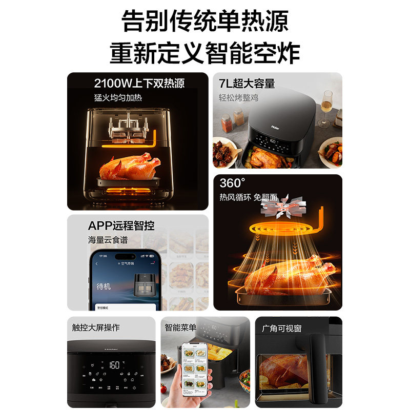 天猫海尔立体双热源空气炸锅可视免翻面金属内腔智能大容量家用新款