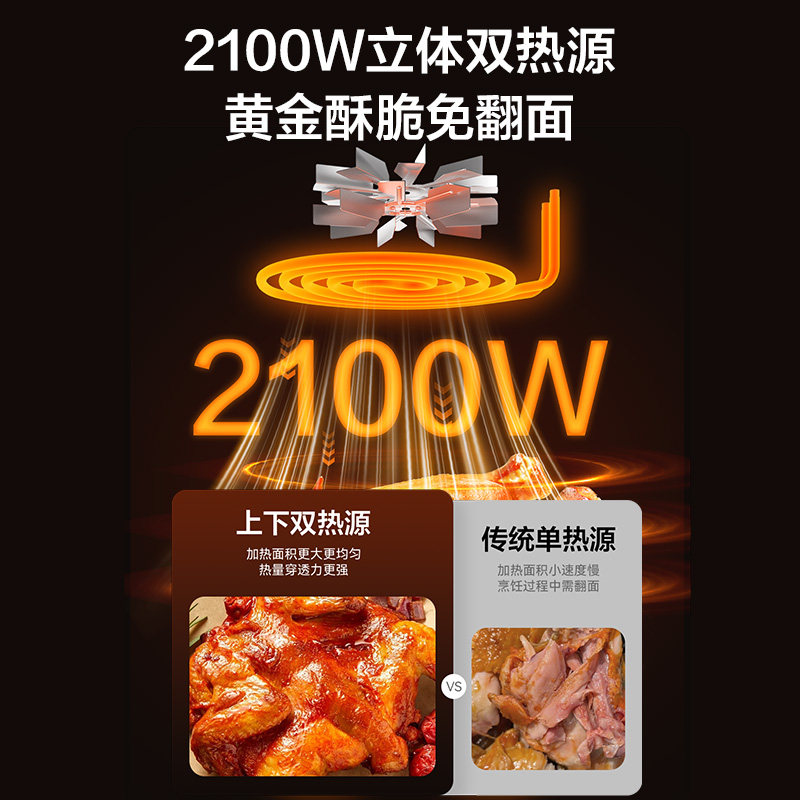 海尔立体双热源空气炸锅,采用创新立体双热源技术,上下环绕加热,实现食材均匀受热,无需手动翻面,轻松享受酥脆口感。配备可视化玻璃窗,烹饪过程一目了然,精准掌控火候。金属内腔坚固耐用,易清洁且耐高温,保障长久使用。智能触控面板搭配多种预设菜单,操作简便,满足不同食材需求。7.5L大容量设计,满足全家聚餐或聚会使用。低脂少油烹饪,健康美味兼得。全新家用款融合科技与美学,是现代厨房的理想之选,让健康美食触手可及。