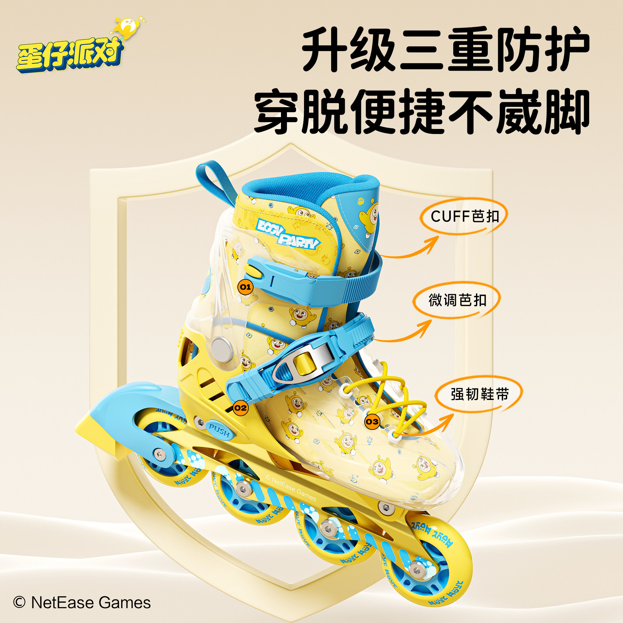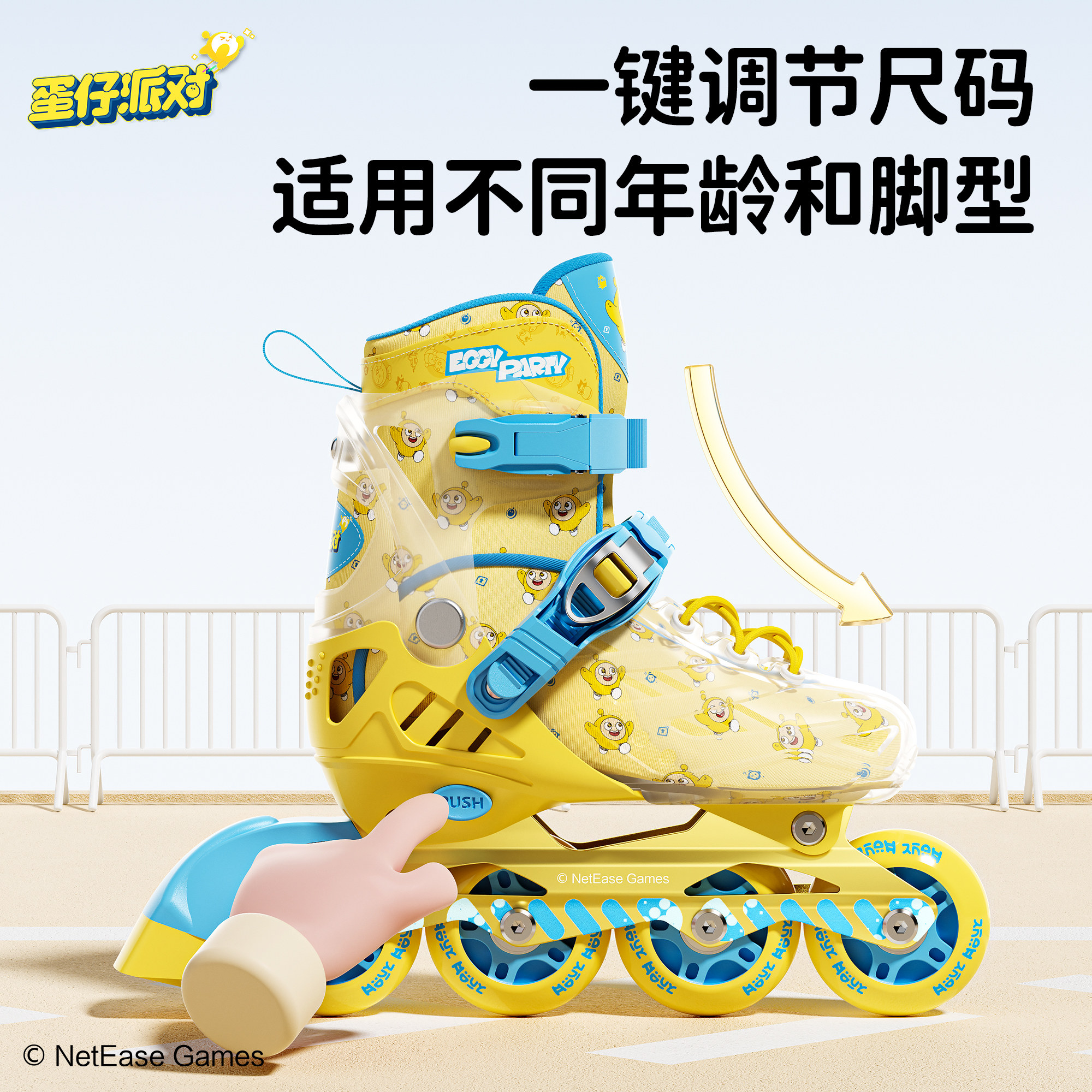 蛋仔派对轮滑鞋专为6-12岁儿童设计,适合女童和男童初学者使用。采用高弹耐磨PU轮,滑行顺滑静音,搭配可调节鞋码设计,适应不同脚型成长需求。鞋身采用透气网布材质,舒适不闷脚,搭配加厚记忆海绵内胆,提供良好支撑与保护。全套装包含头盔、护膝、护肘和护掌,全方位保障滑行安全。坚固的芭扣与魔术贴双重固定系统,穿脱便捷又稳固。时尚可爱的外观设计,激发孩子运动兴趣,是孩子入门轮滑的理想选择,让每一次滑行都安全又快乐。
