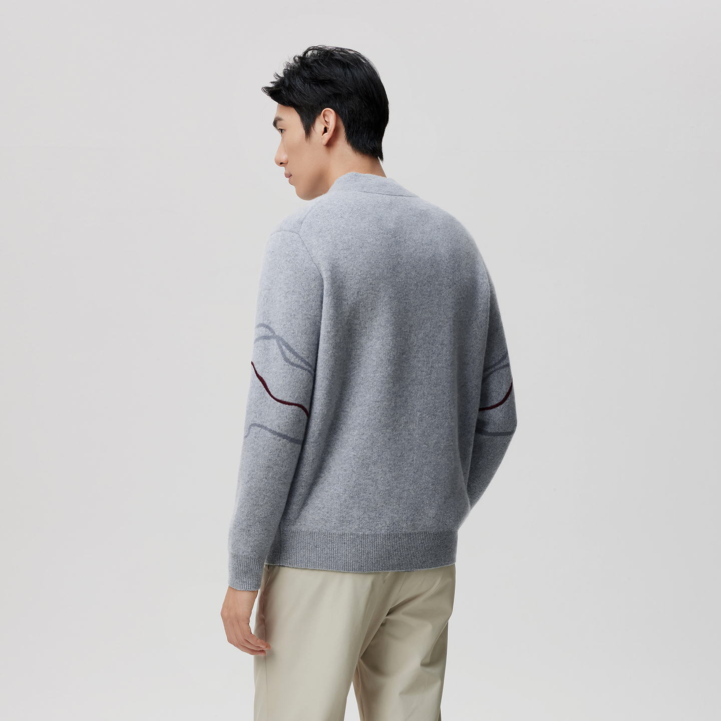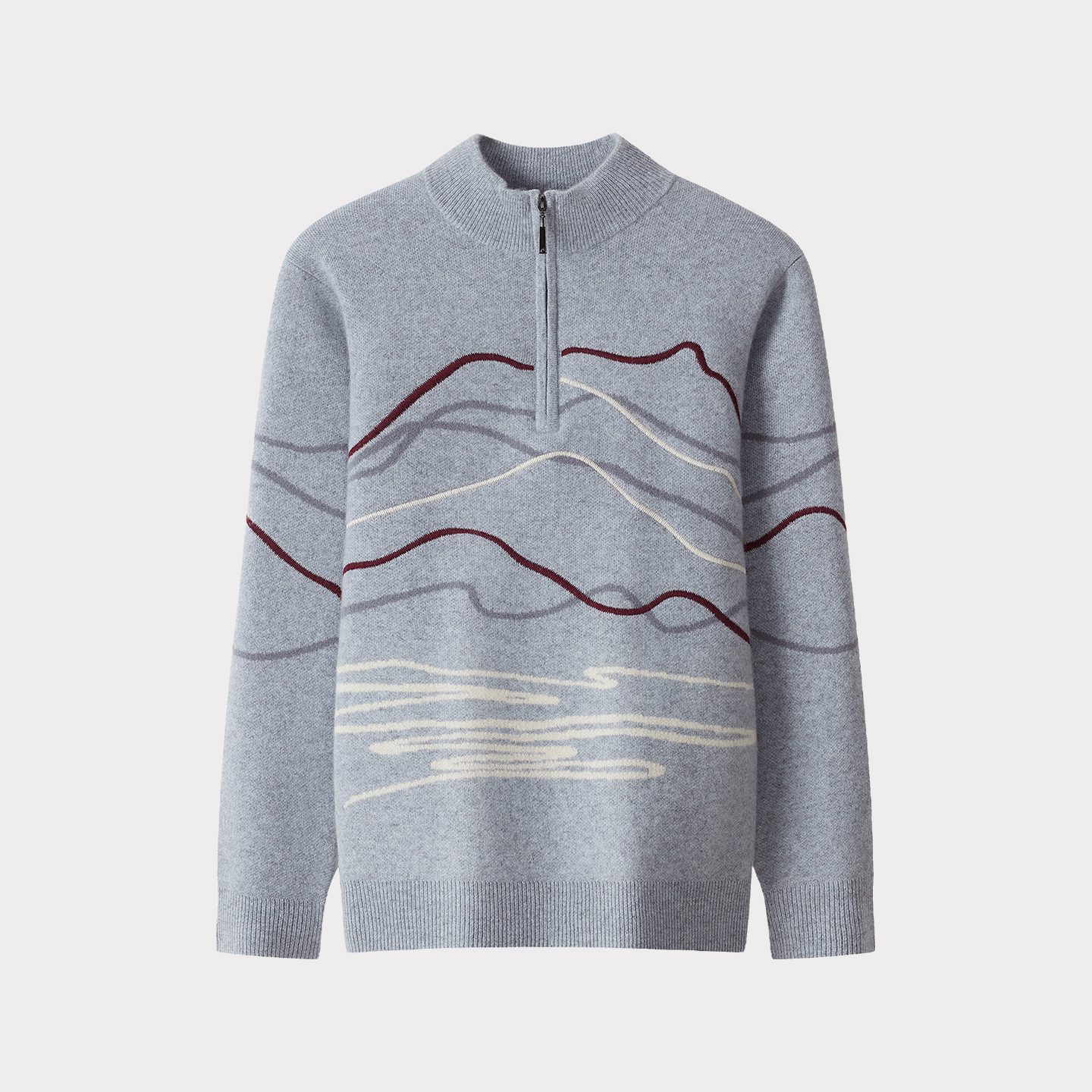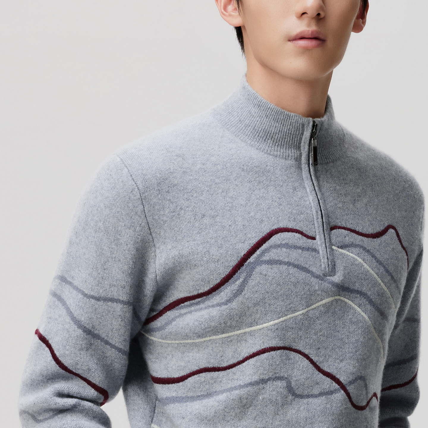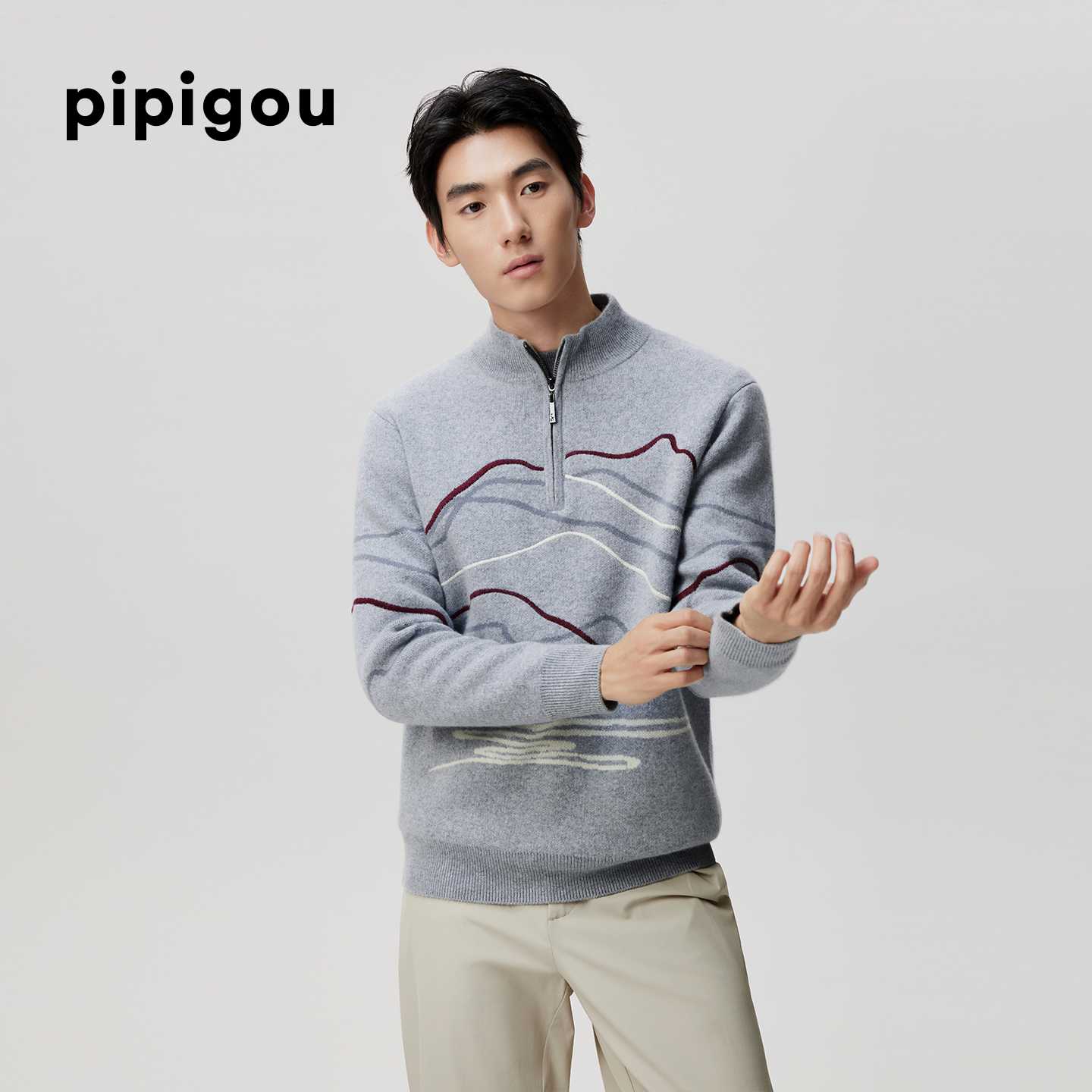 天猫皮皮狗25秋冬新款男士半高领提花羊绒套衫半拉链刺绣装饰线条