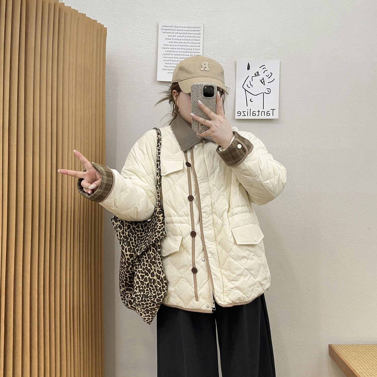 淘宝宛宛大码米白色菱形格翻领撞色羽绒服女冬季胖mm宽松白鸭绒外套潮