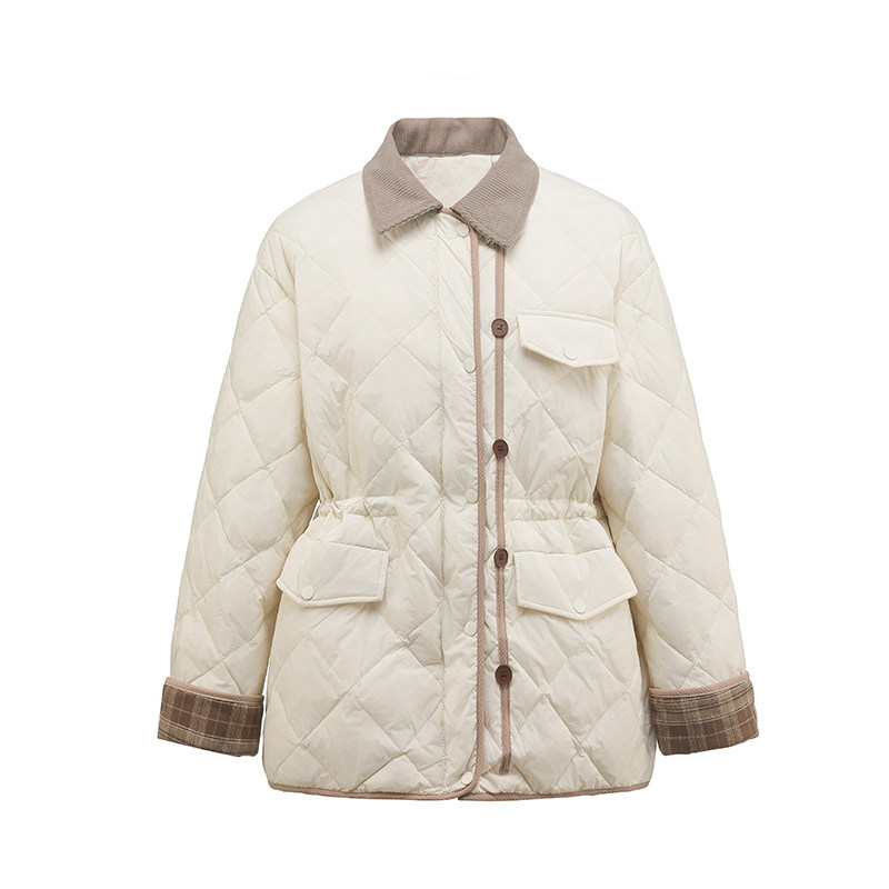 宛宛大码米白色菱形格翻领撞色羽绒服,专为冬季胖MM设计,兼顾保暖与时尚。采用优质白鸭绒填充,蓬松轻盈,锁温效果出众,轻松应对寒冷天气。宽松版型包容性强,不挑身材,穿着舒适自在。经典翻领搭配撞色设计,增添视觉层次感,打破单调。菱形格绗线工艺精致工整,提升整体质感。米白色调温柔百搭,轻松融入各种冬日穿搭。无论是通勤、出行还是日常休闲,都能展现自信潮流风范。宛宛大码羽绒服,让每一位女性在大雪中也能穿出温暖与美丽。