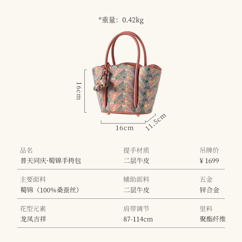 2026年福禄祥鸟蜀锦新中式国风真丝真皮菜篮子手提包,融合千年蜀锦工艺与现代设计美学,以真丝为面、真皮为骨,精工细作。包身绘有寓意吉祥的福禄祥鸟图案,色彩典雅,纹样灵动,尽显东方韵味。提手舒适,结构稳固,兼具实用与美观,既可日常买菜,亦适合出席雅集。作为赠予长辈或妈妈的礼物,不仅传递孝心与敬意,更承载文化传承之美。这款包包是新中式生活方式的典范,将传统匠心与现代生活完美融合,是表达爱与祝福的珍贵之选。