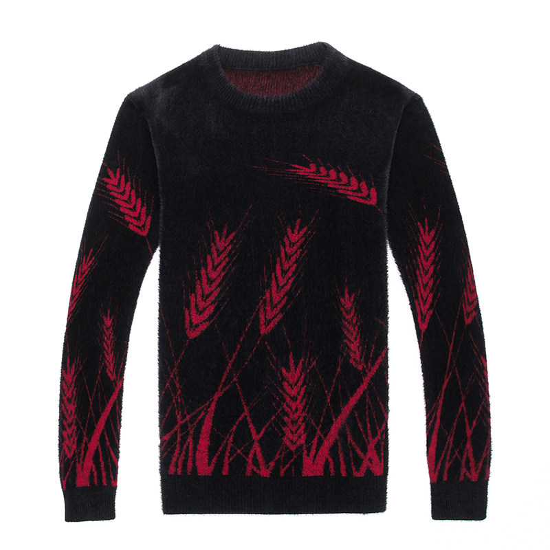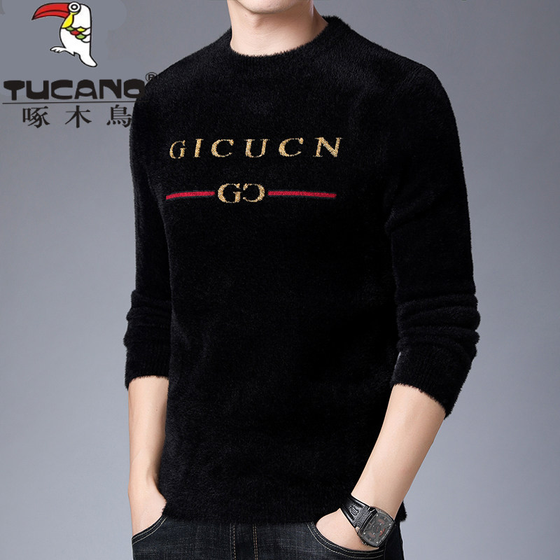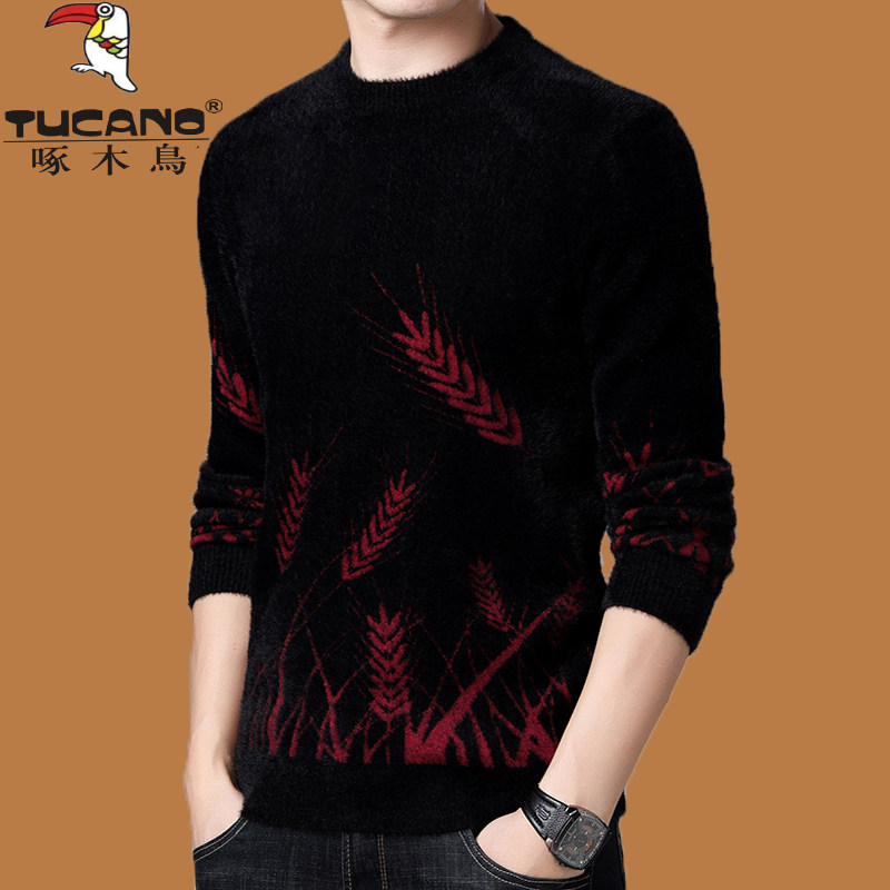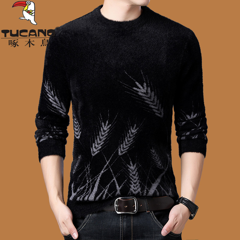 淘宝啄木鸟冬季圆领羊绒衫男士仿水貂绒毛衣加厚保暖提花针织羊毛衫潮