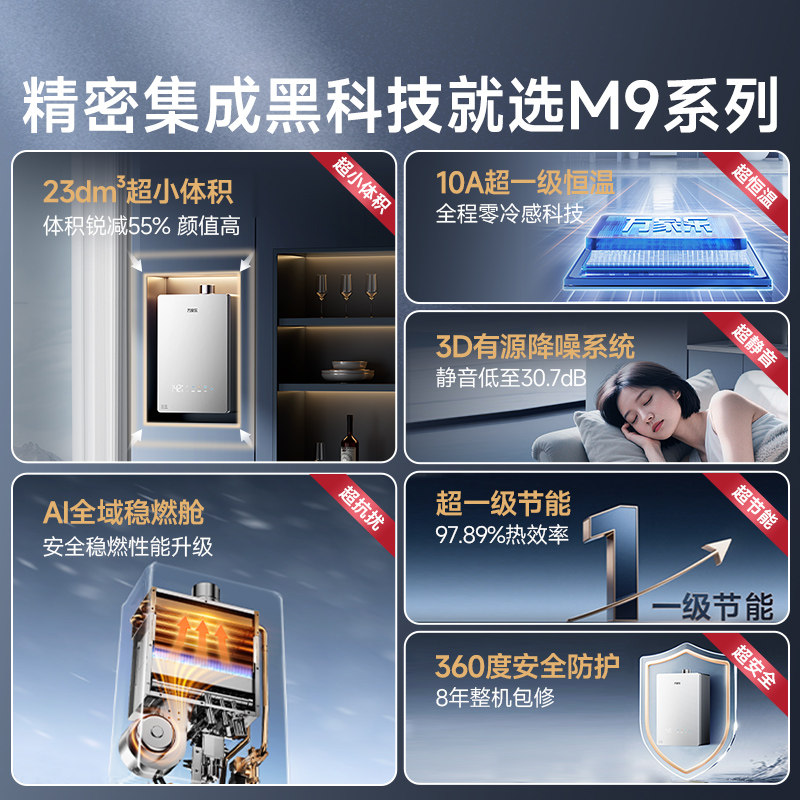 万家乐小体积M9燃气热水器是一款集高效节能与智能舒适于一体的家用热水设备。采用先进的伺服恒温技术,精准调控水温,告别忽冷忽热,沐浴更安心。机身小巧精致,节省安装空间,适配多种户型。搭载增压功能,低水压环境也能畅享澎湃热水。运行低至45分贝,净音设计营造安静家居环境。可选平衡式安装,强排废气更安全,尤其适合高层或密闭空间。支持天然气供气,热效率高,节能环保。智能防冻、多重安全防护,使用更放心。万家乐M9以紧凑身形带来卓越性能,是现代家庭追求品质热水的理想之选。