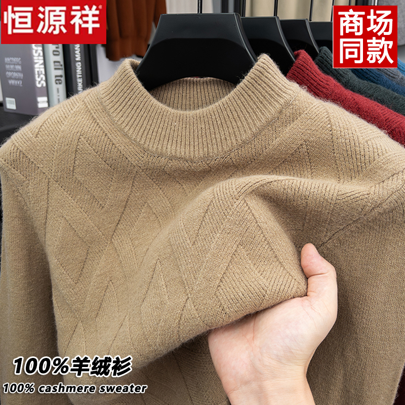 淘恒源祥男士100%纯羊绒衫加绒特加厚圆领毛衣冬季高端一体绒羊毛衫