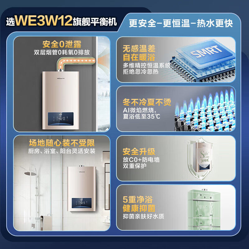 万和平衡式燃气热水器WE3系列,支持天然气与液化气双气源,12升/13L大容量设计,满足全家多点用水需求。采用全封闭平衡式燃烧系统,可安全安装于浴室,无需额外通风,兼顾安全与便捷。搭载智能恒温技术,精准调控水温,告别忽冷忽热。高效节能,低排放,环保更省气。配备多重安全防护,包括防冻、防倒风、熄火保护等,使用更安心。现享品牌补贴,性价比出众,是家庭舒适洗浴的理想之选。万和专注燃气具30余年,品质信赖,服务有保障。