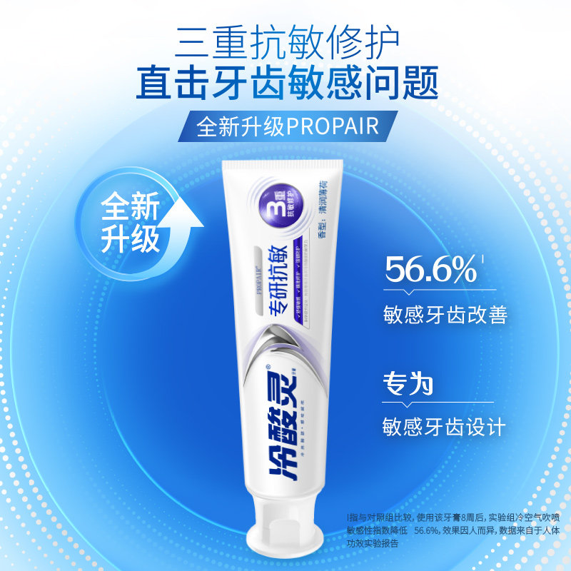 【吴磊代言】冷酸灵专研抗敏牙膏,专为敏感牙齿设计,有效舒缓冷热酸甜刺激,强健牙本质。添加美白因子,温和去除牙渍,重现亮白笑容;特别融入益生菌成分,平衡口腔菌群,持久清新口气。同时强化防龋配方,坚固牙釉质,全面守护口腔健康。成人适用,早晚使用,带来清爽洁净体验。国民品牌冷酸灵携手新生代实力偶像吴磊,以专业科技与信赖品质,守护每一份自信笑容。冷热酸甜,想吃就吃——冷酸灵,抗敏更护齿,让笑容无惧敏感,绽放自然光彩。