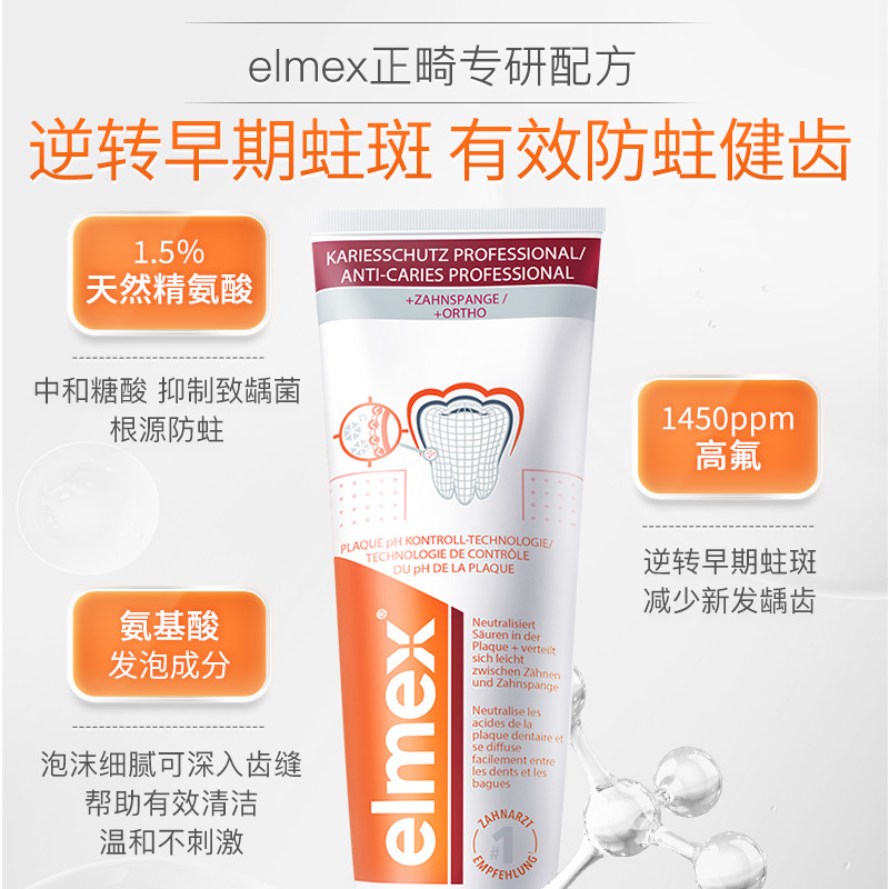 elmex艾美适青少年牙膏12+专为12岁以上青少年及正畸人群设计,含高浓度氟化胺(1450ppm),能有效中和口腔中的糖酸,强化牙釉质,预防蛀牙。其独特配方在牙齿表面形成保护层,尤其适合佩戴牙套者,深入清洁托槽周围难以触及的区域,减少牙菌斑堆积和牙龈问题。低泡温和口感,避免刺激敏感口腔,同时清新口气。elmex作为专业口腔护理品牌,凭借科学配方和临床验证,深受牙医推荐。每日使用,帮助青少年建立健康护齿习惯,守护笑容自信。