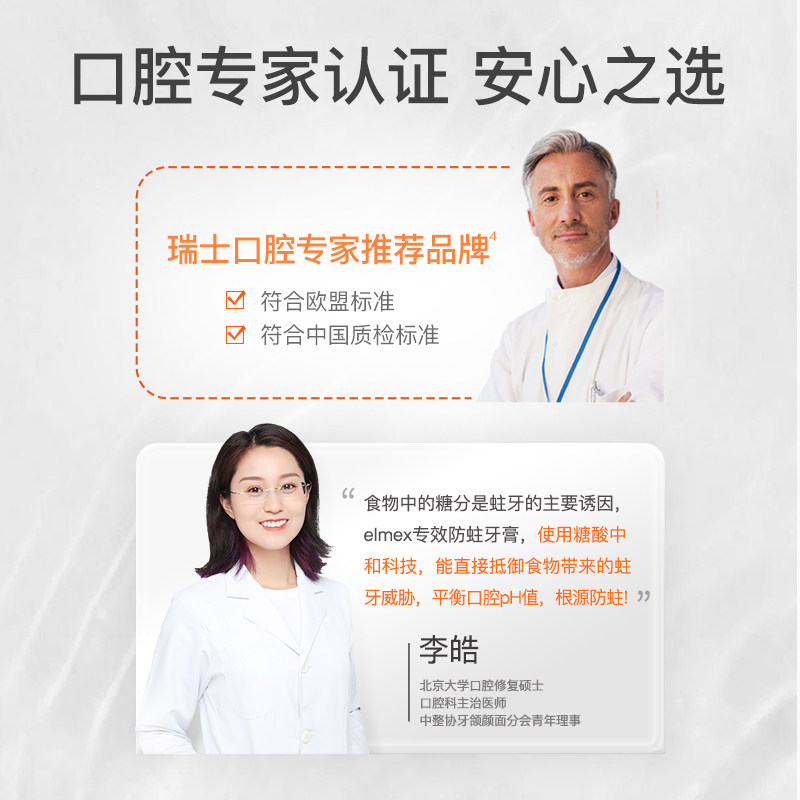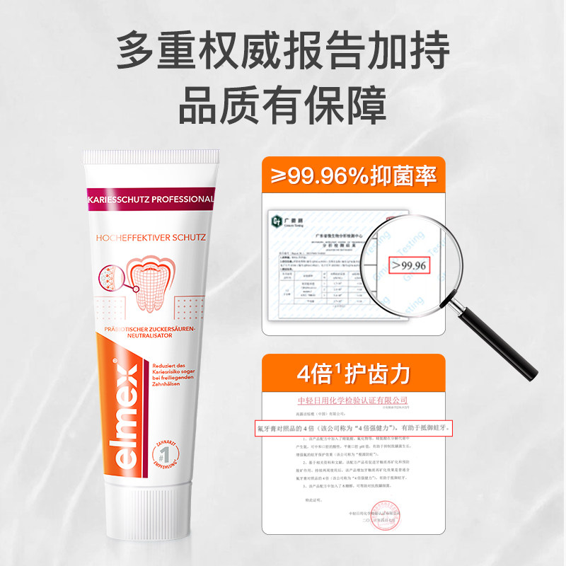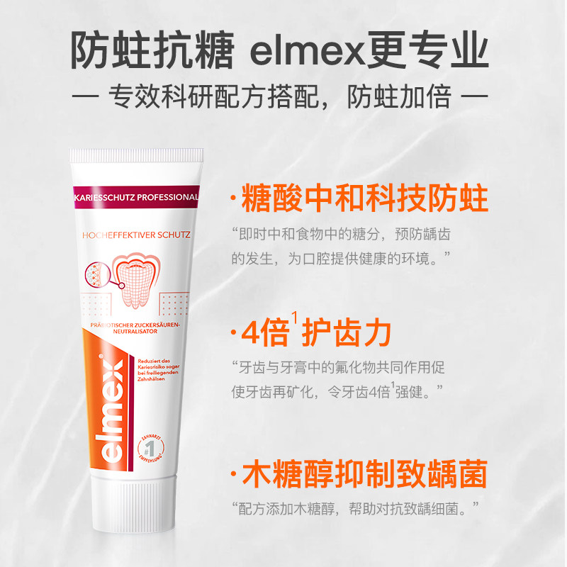 elmex艾美适成人含氟专业防蛀牙膏,源自瑞士,正品原装进口,凭借60余年专业口腔护理经验,深受全球牙医信赖。其核心成分采用独特的奥拉氟(Olaflur)科技,能高效渗透牙釉质,形成坚固保护层,有效预防蛀牙,强化牙齿结构。清新薄荷香型带来持久清爽口感,温和清洁同时呵护牙龈健康。不含争议成分,适合日常使用,尤其适合注重防蛀与口腔健康的人群。elmex坚持高标准品质控制,每一支牙膏均通过严格检测,确保安全有效。选择elmex,就是选择专业、信赖与健康的口腔护理体验,让笑容更自信、更持久。