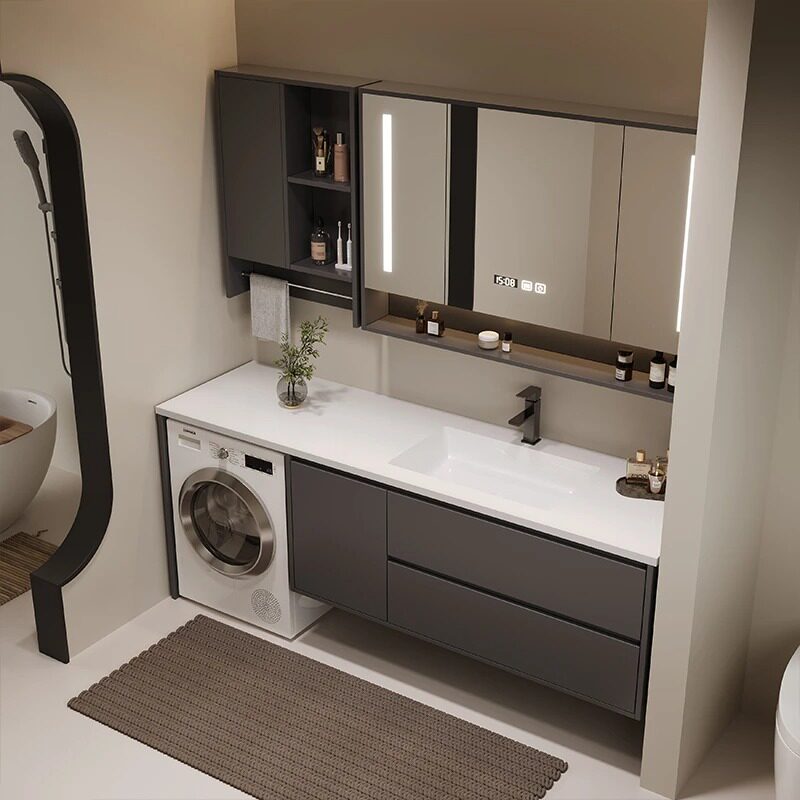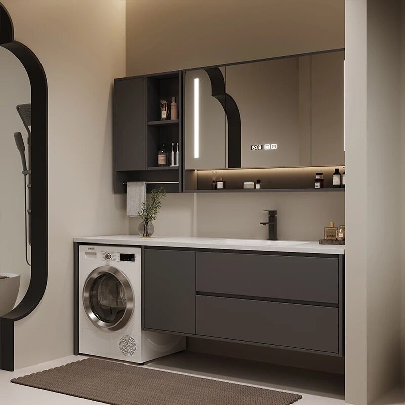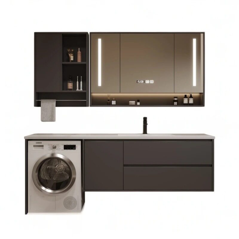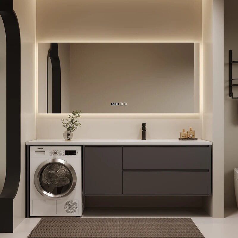 这款阳台岩板浴室柜洗衣机一体柜组合,专为现代简约风格卫生间及阳台空间定制设计。采用高品质岩板台面,耐磨耐高温,触感细腻,搭配台下盆设计,清洁便捷。柜体选用防水防潮材质,结构稳固,经久耐用。巧妙整合洗衣机位,优化空间利用,实现洗漱、洗衣一体化功能。整体线条简洁流畅,配色雅致,适配多种家居风格。可根据实际空间尺寸个性化定制,满足收纳与美观双重需求,是提升阳台或小型卫生间实用性与设计感的理想之选。