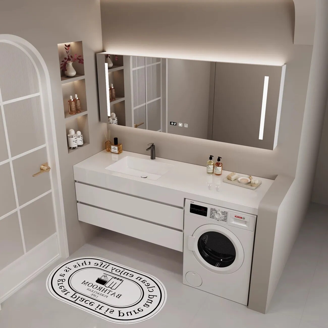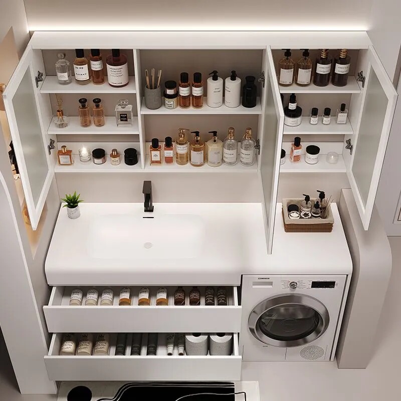 这款浴室柜组合洗衣机伴侣一体柜,采用可丽耐肤感一体岩板打造,表面细腻温润,触感如肌肤般柔滑,兼具高颜值与实用性。无缝设计有效防止水渍渗透和污垢堆积,清洁更便捷,持久耐用。巧妙融合洗漱台与洗衣机收纳功能,空间利用率高,适合小户型卫生间。整体造型简约现代,线条流畅,搭配隐藏式储物空间,满足日常洗漱用品收纳需求。防潮防霉材质确保在潮湿环境中稳定使用,是兼顾美观、功能与品质的理想卫浴解决方案。