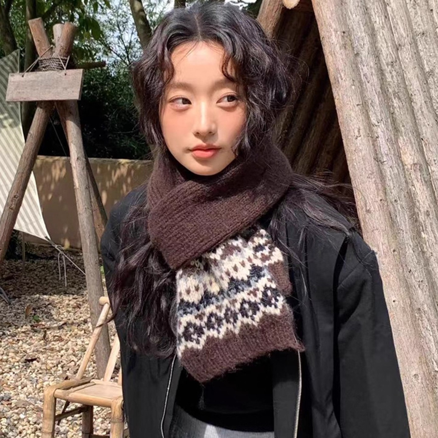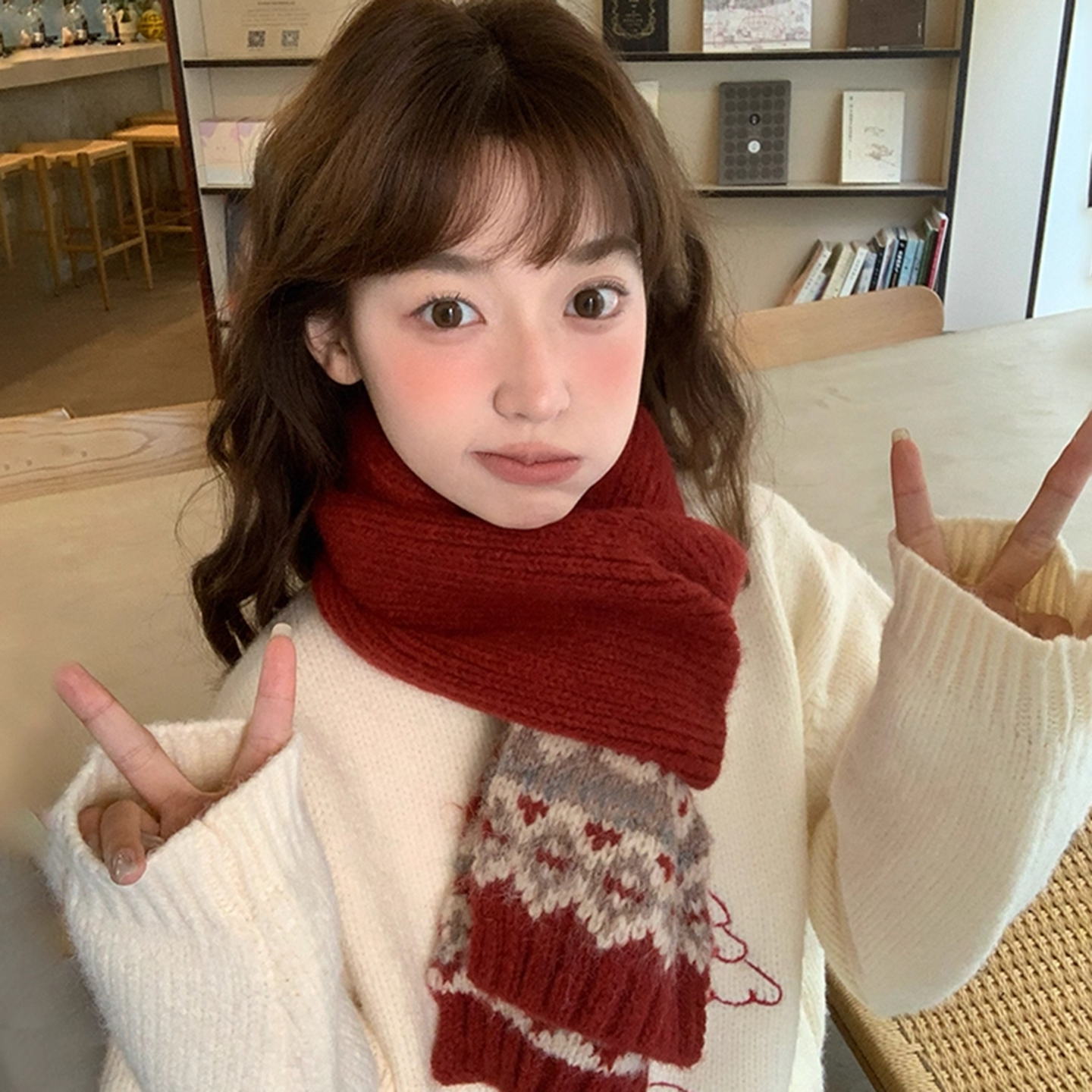 淘宝复古费尔岛风新年红色毛线针织围巾女冬季新款韩系氛围感保暖围脖