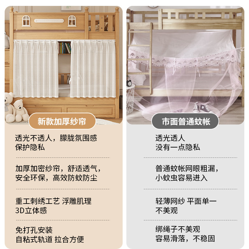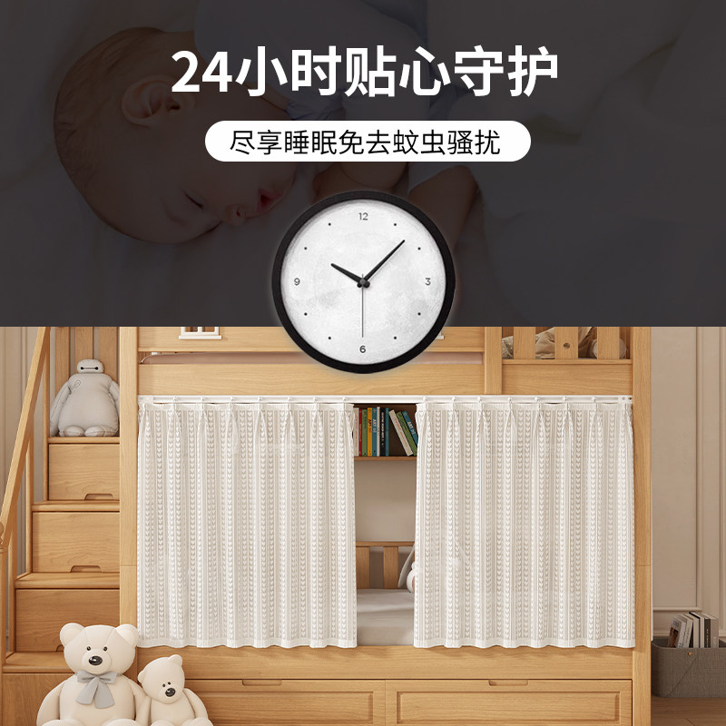 上下铺专用儿童床帘子母床防蚊纱帘,专为宿舍、寝室及家庭卧室设计,有效防蚊通风,守护孩子安睡。采用优质加密纱网,透气透光,阻隔蚊虫的同时保持空气流通。搭配静音滑轨系统,开合顺滑无声,夜间使用不扰人。围挡式设计全面覆盖床体四周,防止孩子翻身跌落,安全贴心。安装简便,适配标准上下铺及子母床尺寸,可拆卸清洗,耐用易打理。简约素雅外观,融入多种家居风格,既是实用防蚊屏障,也是温馨睡眠空间的点缀,为儿童营造安全、舒适、私密的休息环境。