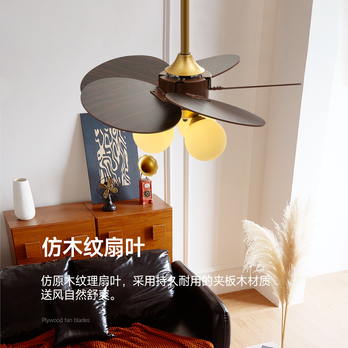 天繁简【旋幕】中古风客厅风扇灯胡桃木美式复古全铜大扇叶餐厅吊灯