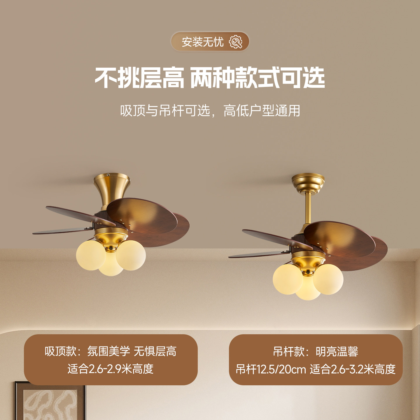 繁简【旋幕】中古风客厅风扇灯胡桃木美式复古全铜大扇叶餐厅吊灯