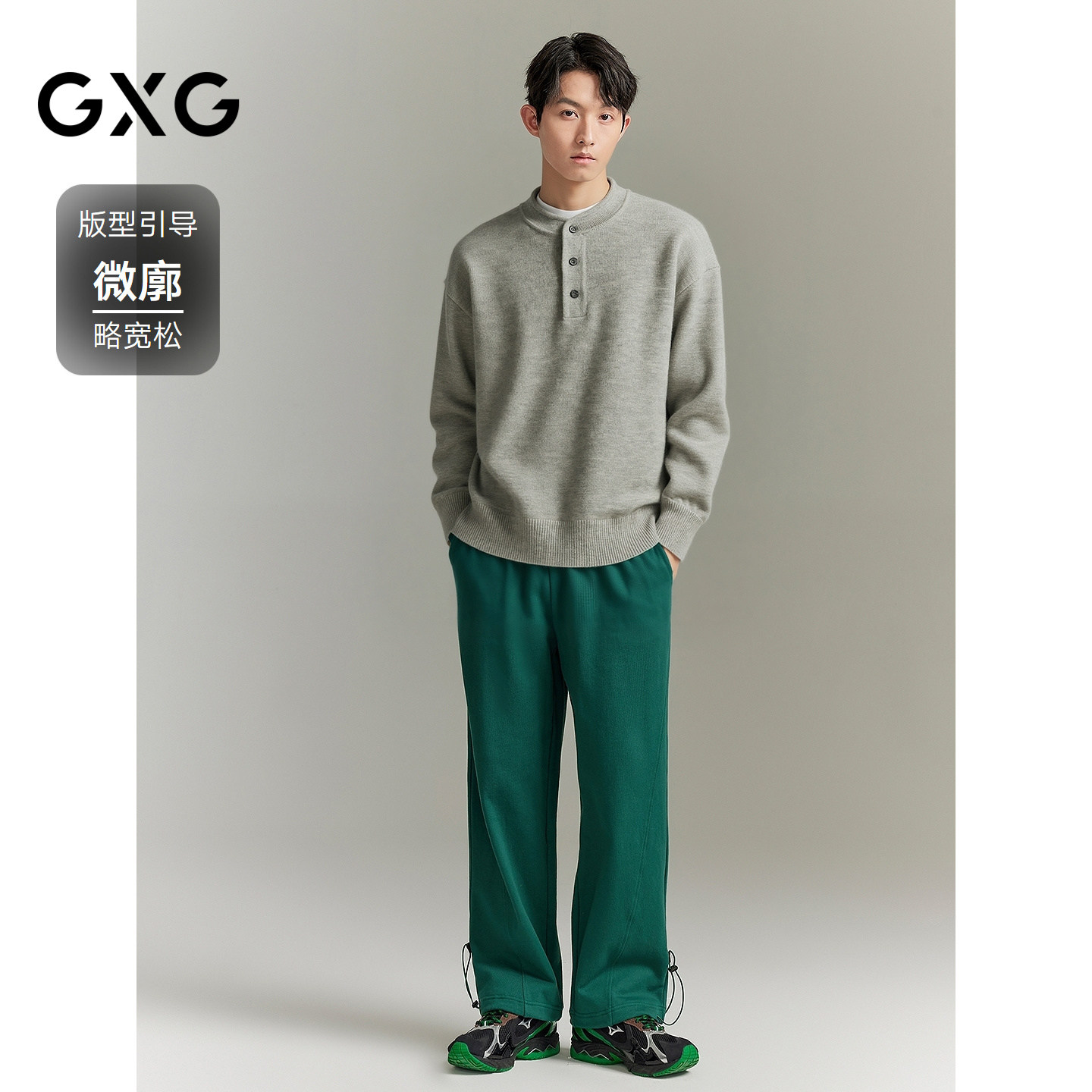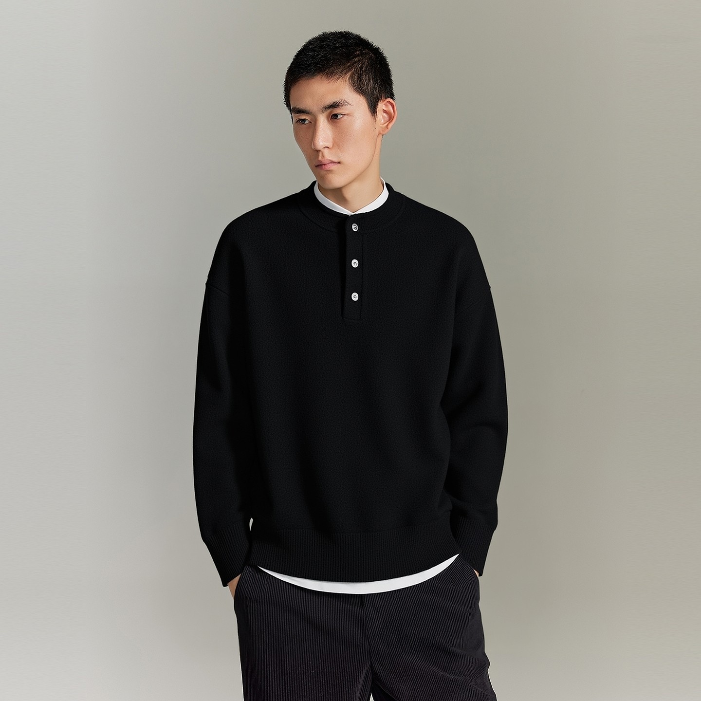 美式复古亨利领珠地棉扣领长袖针织衫男士慵懒风休闲重磅毛衣毛衫