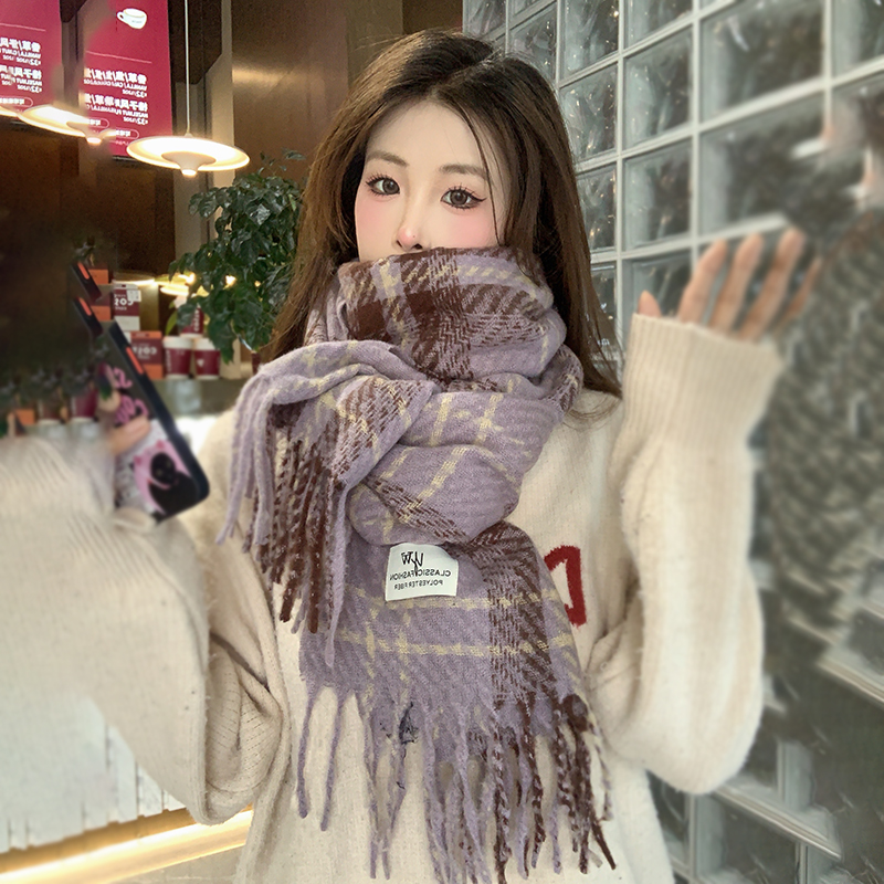 2025年冬季新款韩版时尚紫色格纹流苏围巾女加厚保暖披肩两用百搭