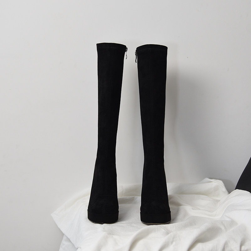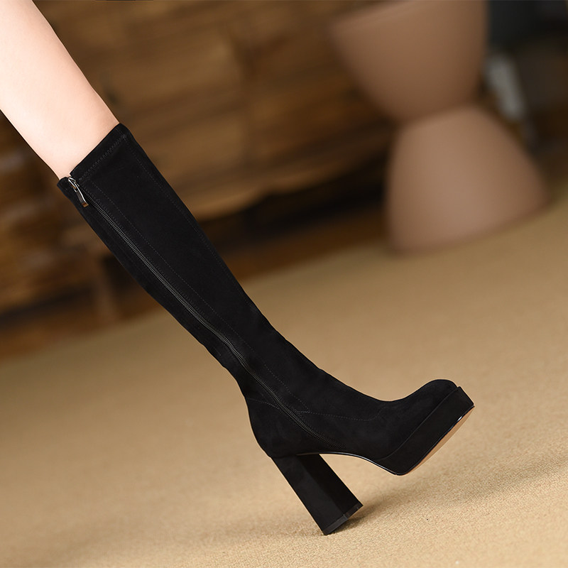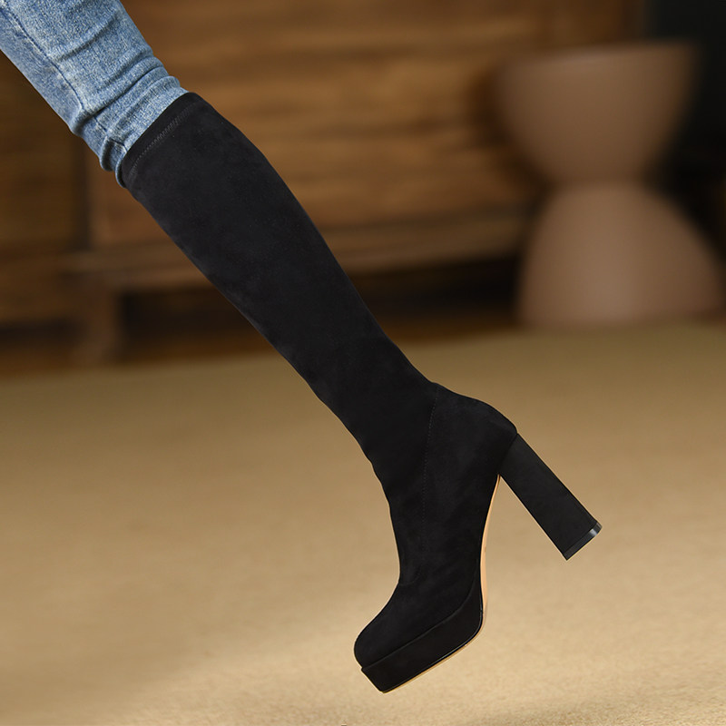 淘宝misili 弹力靴黑色粗跟长靴秋冬季新款9.8cm高跟鞋方头厚底女靴子