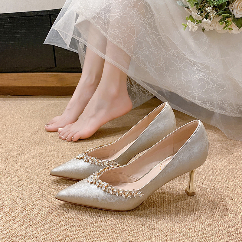 这款法式高跟鞋以优雅香槟色为主调,融合精致水钻装饰,闪耀却不浮夸,完美契合婚礼、宴会等正式场合。鞋面采用细腻光泽面料,线条流畅,凸显法式浪漫与高级质感。无论是搭配婚纱、礼服,还是作为伴娘鞋,都能轻松提升整体气质。尖头设计拉长腿部线条,舒适中跟兼顾美观与实穿性,单鞋款式百搭各类裙装。无论是新娘的优雅点缀,还是伴娘的得体之选,这双鞋都堪称绝美之选,为重要时刻增添一抹动人光彩,尽显女性柔美与自信魅力。