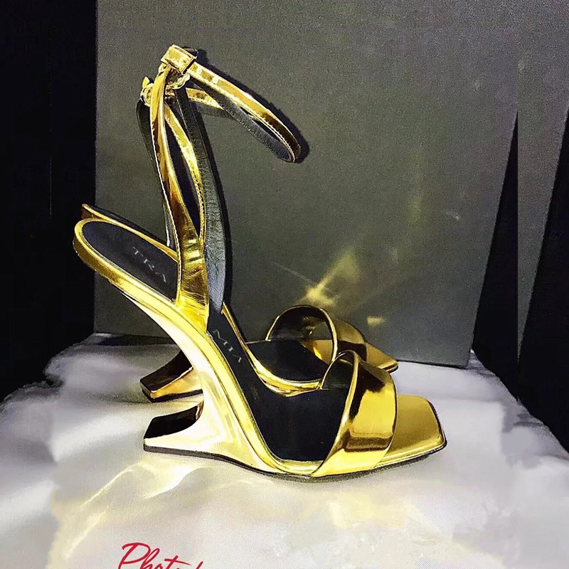 淘宝欧货2025年新款夏季金色超高跟鞋异形跟走秀性感百搭一字带凉鞋女