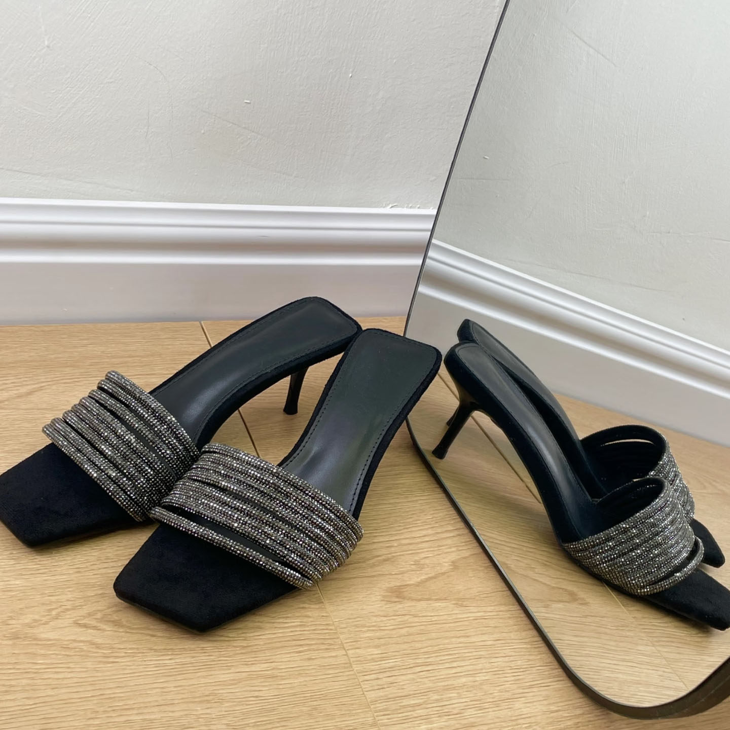 淘2024夏季方头裸色香槟色水钻一字带高跟凉拖凉鞋细跟半拖鞋外穿女