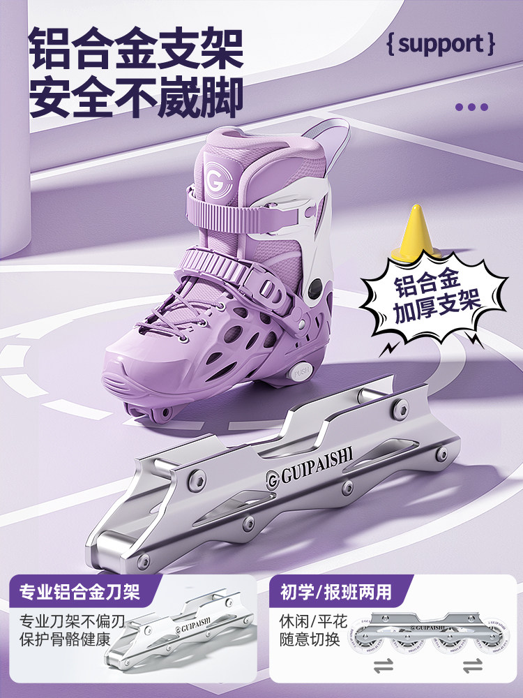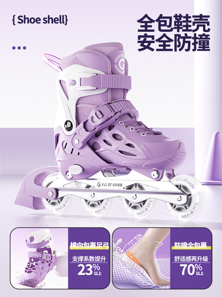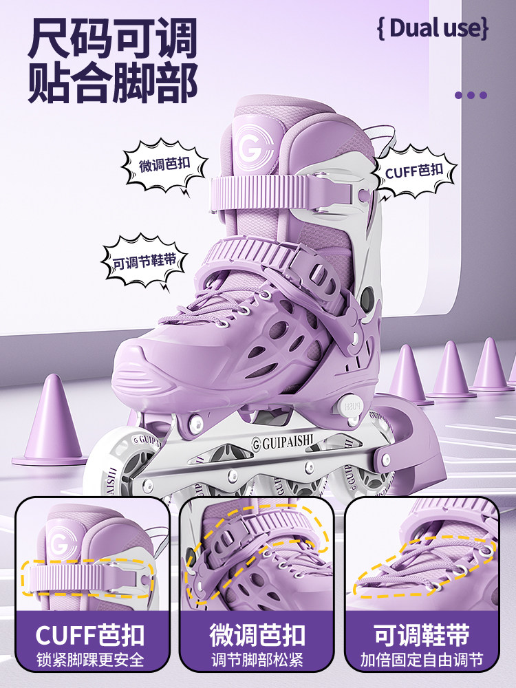 这款全套装轮滑鞋专为儿童和初学者设计,适合男童、女童及成人使用,兼顾安全性与舒适性。采用高弹耐磨PU轮,抓地力强,滑行顺滑稳定;加厚透气内胆搭配可调节魔术贴与芭扣设计,贴合脚型,有效保护脚踝。鞋架为高强度工程塑料,承重强、抗冲击,确保滑行安全。全套配备护具(护膝、护肘、护掌)及头盔,全方位防护,让初学者安心练习。多尺码可选,轻松调节,满足不同年龄段需求。无论是室内还是户外,都能畅享轮滑乐趣,是孩子运动启蒙和亲子互动的理想之选。