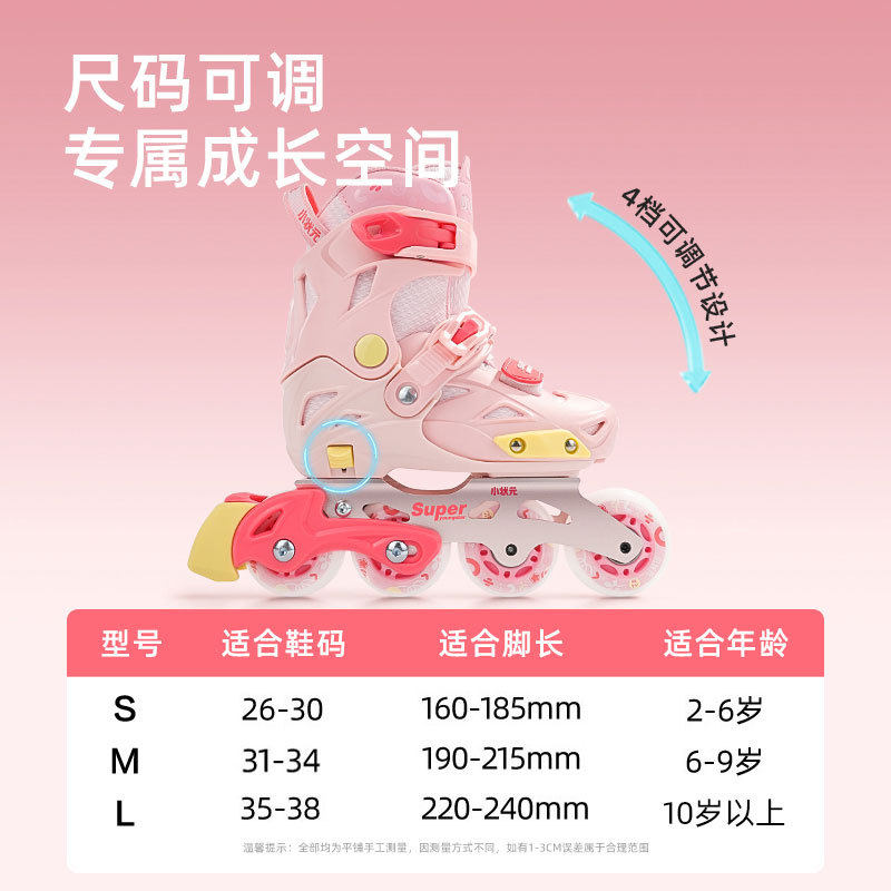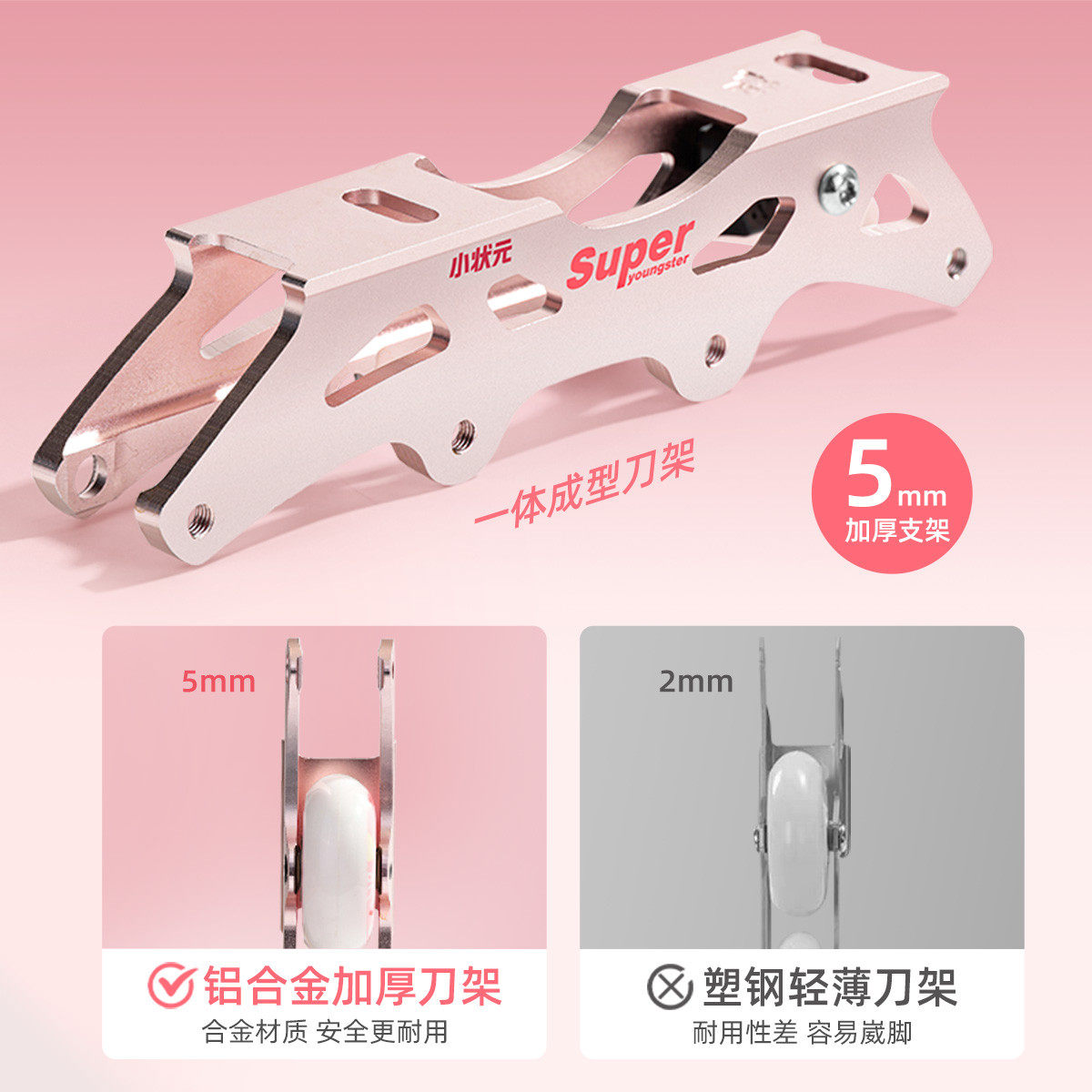小状元S5溜冰鞋专为女童初学者设计,是一款专业儿童轮滑鞋,兼顾安全性与舒适性。采用高强度PP材质外壳,有效保护脚踝,搭配可调节码数设计,适应不同脚型成长需求。鞋身轻便透气,内里柔软加厚,长时间滑行也不易疲劳。配置高弹耐磨PU轮,抓地力强,滑行稳定,适合平花练习和日常滑行。轴承顺滑静音,提升滑行体验。多色可选,外观时尚可爱,深受小女孩喜爱。小状元S5是初学轮滑的理想之选,助力孩子在安全中畅享滑行乐趣,逐步提升技巧与自信。