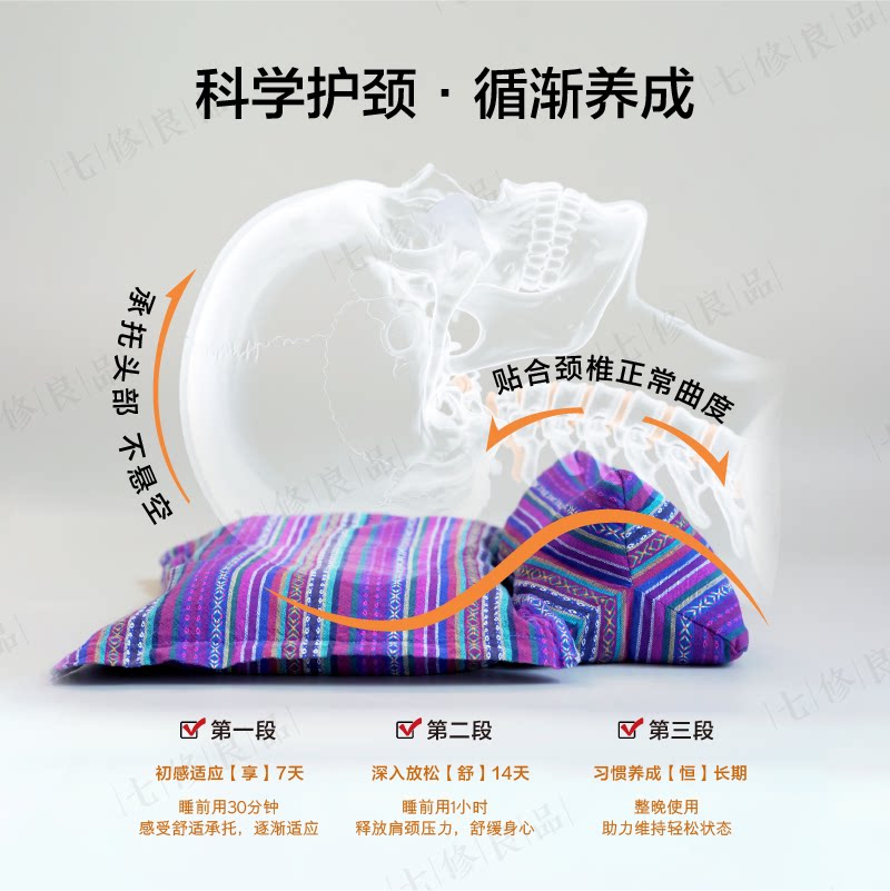 七修颈椎枕+平枕组合枕是一款专为深度睡眠与颈椎健康设计的护颈枕,融合现代人体工学与传统非遗工艺。采用天然山苍子填充,散发淡雅清香,具有安神助眠、驱螨抑菌的功效。高低双区设计,七修颈椎枕贴合颈部曲线,有效缓解颈椎压力;搭配平枕使用,满足不同睡姿需求,实现仰睡、侧睡自由切换。枕套选用亲肤透气面料,柔软亲肤,四季皆宜。作为非遗技艺传承产品,山苍子护颈枕不仅守护颈椎健康,更承载文化温度,是追求高品质睡眠人群的睡眠专用之选,助您夜夜深睡,晨起神清气爽。