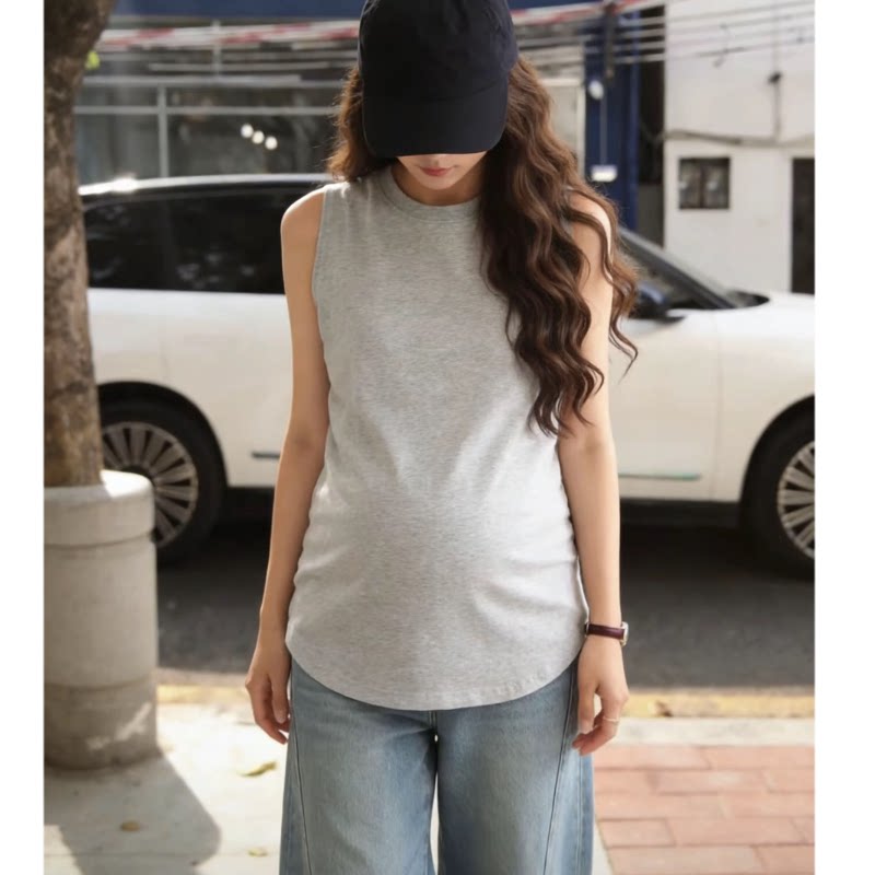 这款无袖孕妇装背心,专为夏季打造,融合ins风简约时尚元素,外穿内搭皆宜。采用优质纯棉面料,亲肤透气,柔软舒适,呵护孕妈敏感肌肤。经典圆领设计,简约大方,轻松搭配各种下装。宽松版型巧妙遮肚,不束缚腹部,给予孕肚自由呼吸空间。侧边开叉细节增添设计感,行走间更显灵动飘逸。无论是居家、出行还是拍照打卡,都能轻松驾驭,展现孕妈专属的优雅与自信。是孕期穿搭的实用又时髦之选。